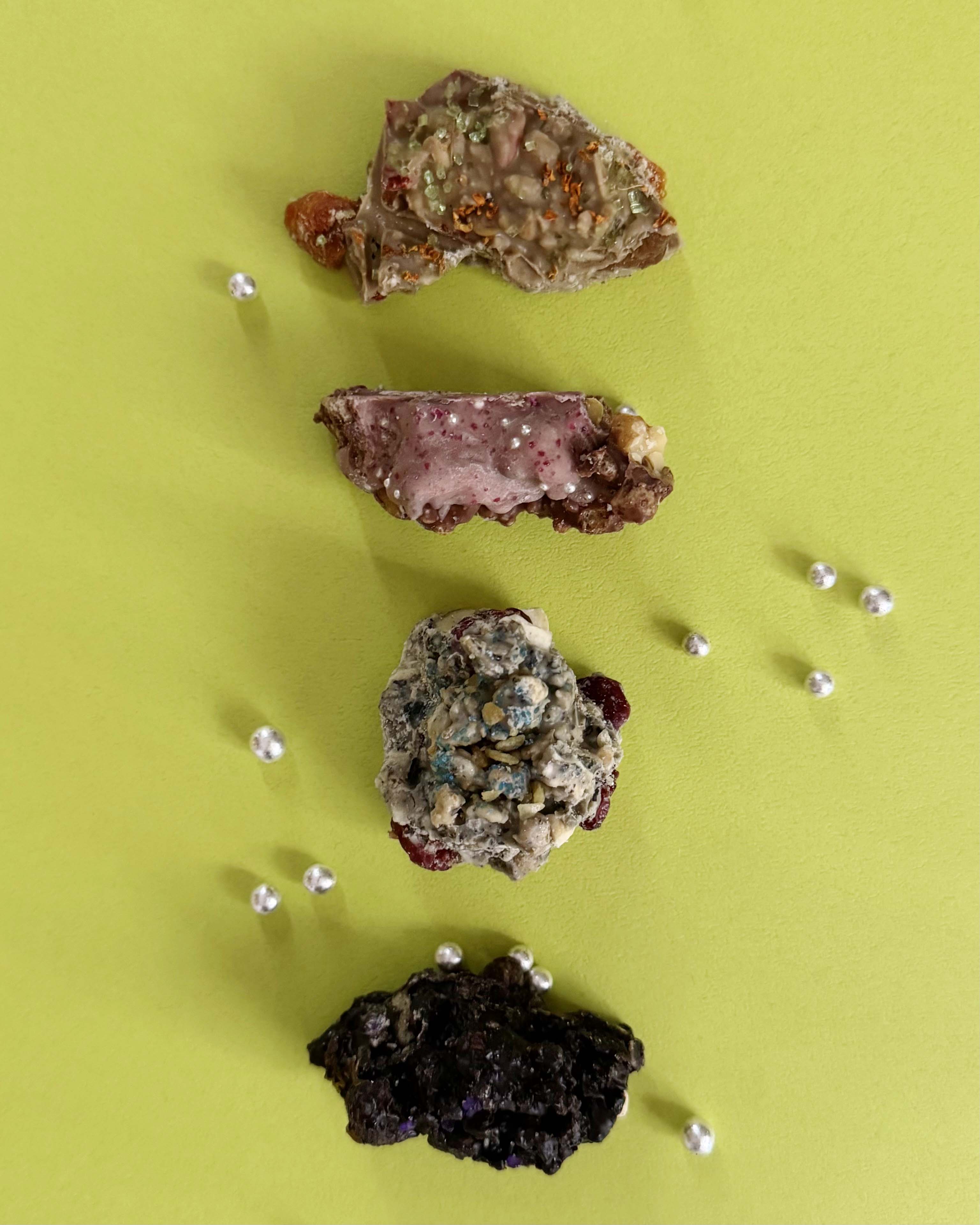 ざくざく香ばしいかき餅味、甘酸っぱい柘榴とルバーブ、