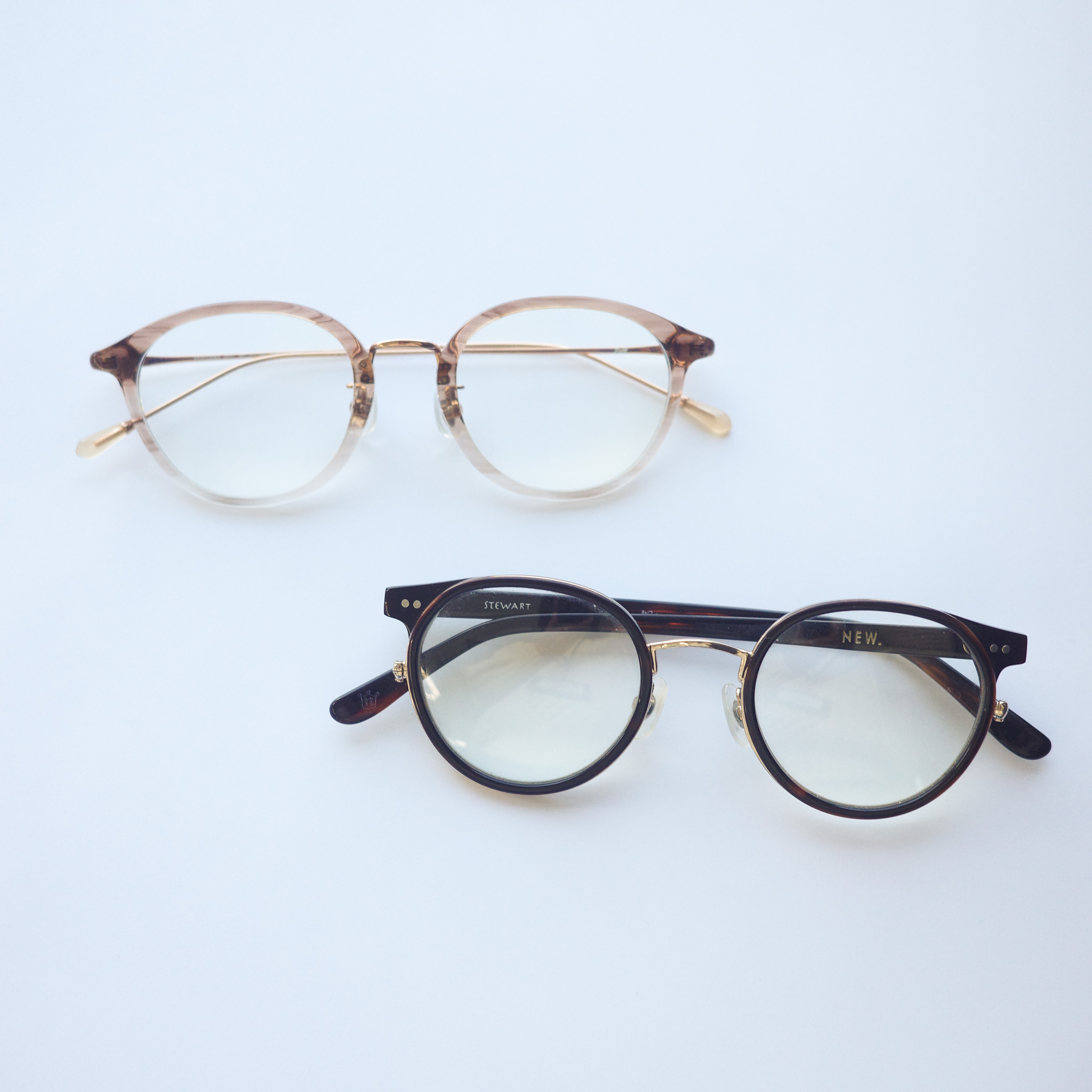写真上は《Zoff(ゾフ)》の軽やかなクリアフレーム、写真下は《New.》のクラシックな濃色フレーム。《Zoff》のメガネは春夏のTシャツなどのカジュアルなスタイルに、《New.》のメガネは秋冬のトラッドなスタイルにと、スタイルに合わせて使い分けています。