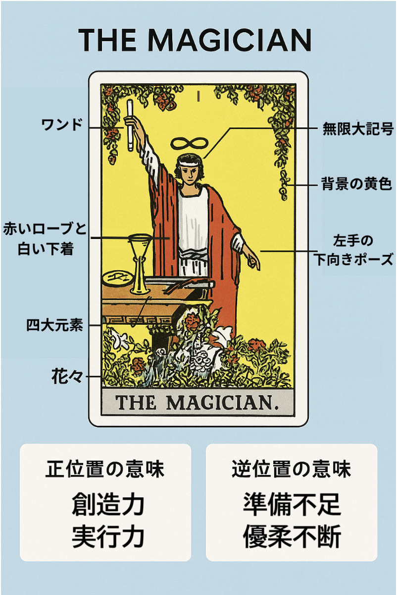 「魔術師」のカードをじっくり見てみると、彼のポーズや持ち物、周りの風景にも、たくさんの秘密が隠されているんだ。まず、彼が右手に高く掲げている杖(ワンド)。これは、天からのエネルギーやインスピレーションを受け取るアンテナみたいなもの。そして、左手は地面を指しているでしょう。これは、天から受け取ったエネルギーを、この地上で、現実の世界で形にしていくっていう、強い意志と実行力を表しているんだ。「天と地を繋ぐ」なんて、なんだかカッコイイよね!