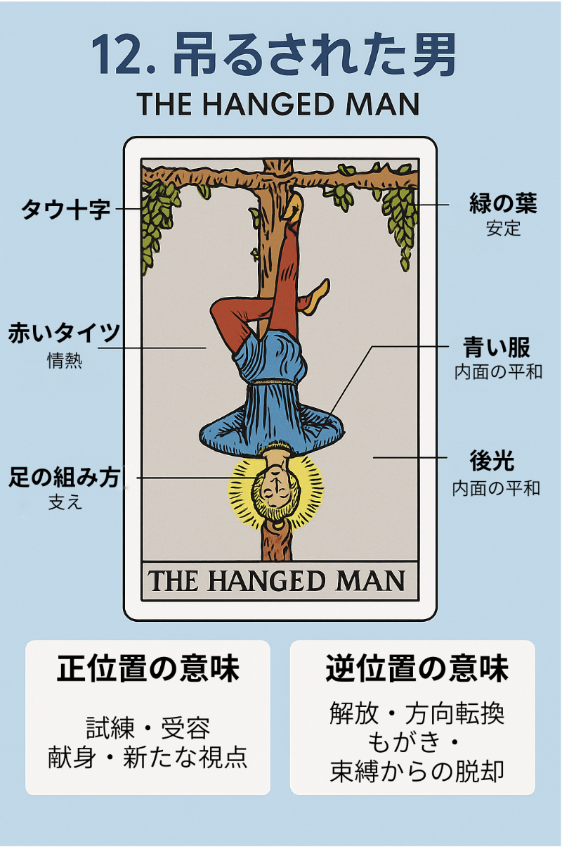 逆さまに吊るされたその姿は、決して苦悩の象徴ではありません。彼の足元に描かれた「タウ十字」は、試練を通じた魂の成長を意味し、彼が自ら進んでこの状況を受け入れていることを示しています。片足で組まれた姿勢は、支えと均衡の象徴。動けないように見えて、実は“静けさの中に安定を見出している”のです。
