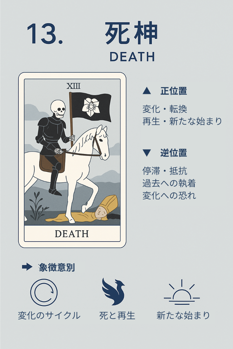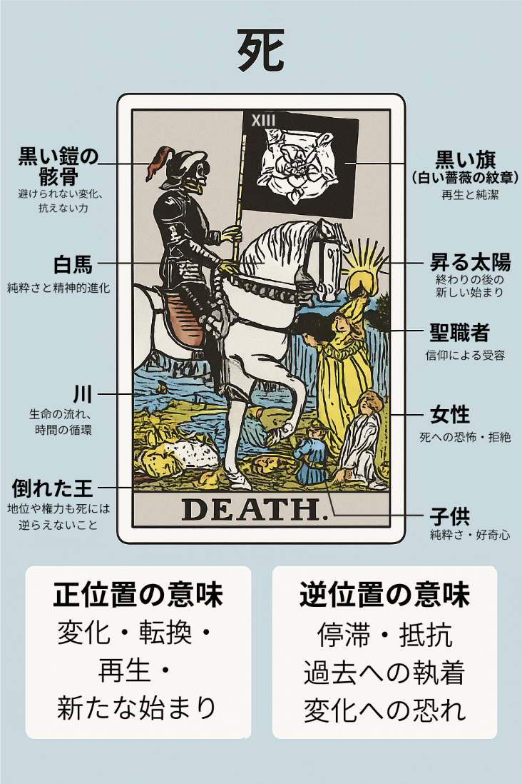 - 死神カード: 自然で必要な変化。人生のサイクルの一部として起こる変化で、基本的には受け入れるべきもの。