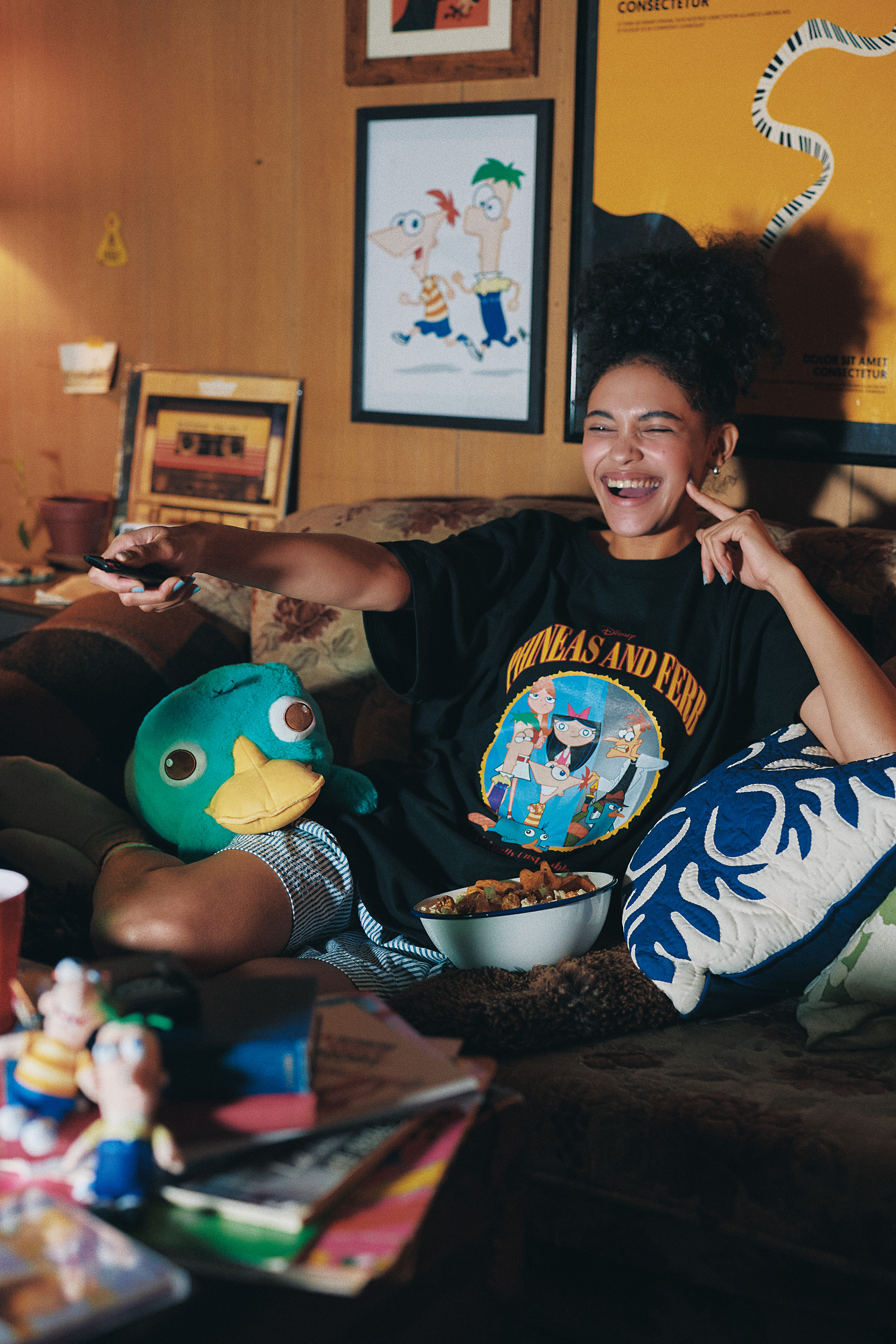 土曜の夜は、ポップコーン片手に「ディズニー・チャンネル」を見るのがルーティーン。映画やドラマもいいけれど、今日の気分はオリジナルアニメーションの『フィニアスとファーブ』。ひらめき力抜群のフィニアスと、無口で天才のファーブが、夏休みを全力で楽しむために奮闘する様子が最高!そうそう、この間ゲットしたこのTシャツもキャッチーでイケてるでしょ?