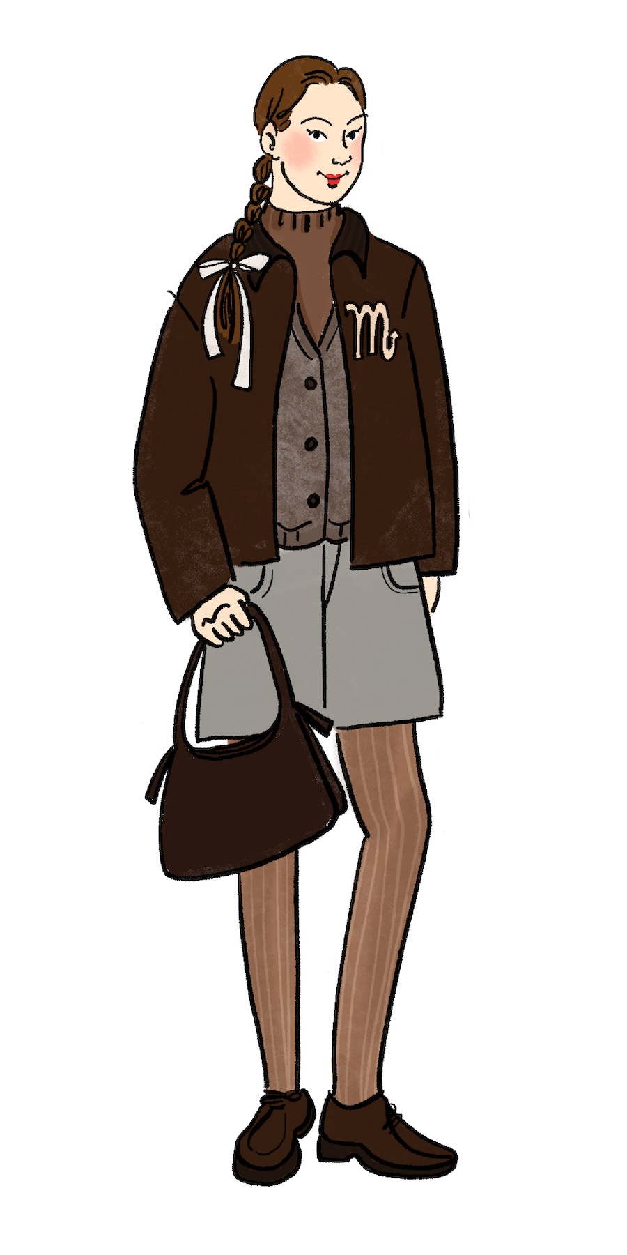 温度のあるブラウンは、蠍座さんの静かな情熱を整える色。ブラウンのニットやスカートで落ち着きをオン。レザーバッグやブレスレットを添えると存在感が深まり、信頼が集まる半年に。