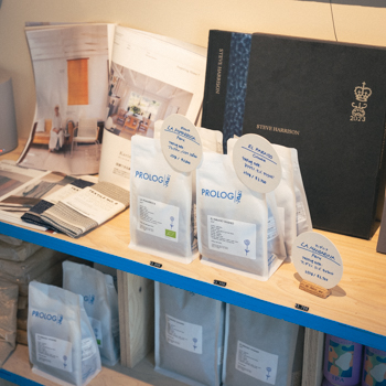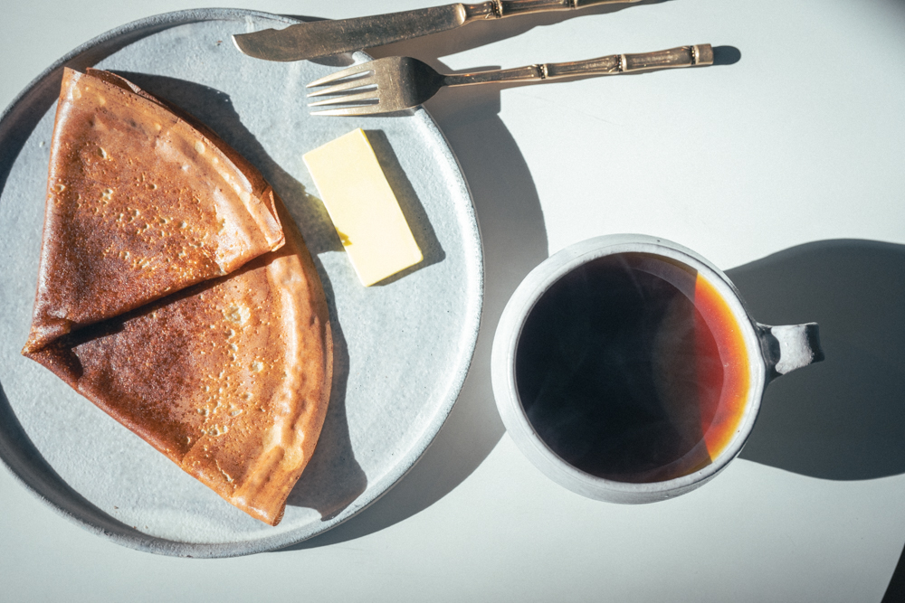 東京・代々木上原と笹塚のちょうど間くらいの場所にあるクレープカフェ〈ØC tokyo(オーシー トーキョー)〉。モダンでクリーンなスタイルの店舗は、家具や什器にあしらわれたキーカラーのブルーがアクセント。ここで楽しめるコーヒーは、デンマーク発〈プロローグコーヒー〉のもの。味の詳細は種類により異なるものの、どれもいわゆる日本的なスペシャルティコーヒー(ex.深煎りで余韻がある)よりも軽やかでフルーティーなフレーバーが特徴。ともにいただきたい名物の「クレープ」は、シェフの田井將貴さんがデンマークのコペンハーゲンで暮らしていた頃、日常的に嗜んでいたレシピが原点で、最初のひとくちでその見た目から想像する以上に“シンプル イズ ベスト”を実感させられる美味しさ。お皿に添えられたグラスフェッドバターのリッチなミルク感と適度な塩味が生地のうまみをさらに引き出してくれる。「北欧らしいティーライクなコーヒーとこのクレープのペアリングは最高だよ」とファージー。