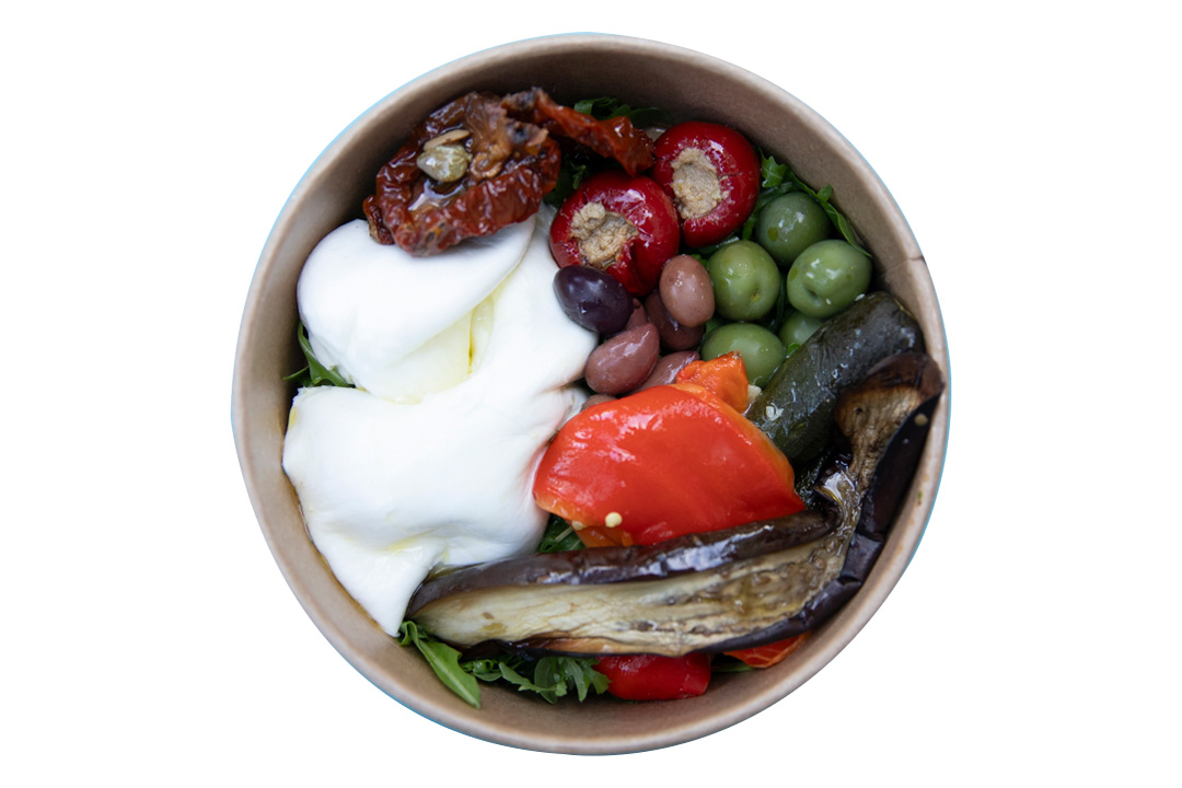 具沢山のサラダボウルも人気メニューのひとつ。オリーブ、ナス、パプリカ、ドライトマトなどの野菜は、濃厚かつボリューミーなモッツァレラとベストマッチ! 。14€
