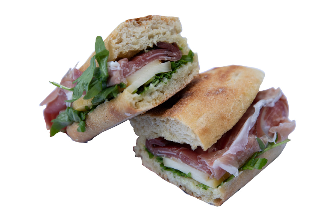 美味しさを表現する感嘆の声と、看板商品のモッツァレラを掛け合わせたユニークなネーミングのサンドウィッチ屋〈Mmmozza…!〉。写真は、注文を受けてからスライスする燻製生ハムに、クリーミーな水牛のモッツァレラ、みずみずしいレタスがボリュームたっぷりにサンドされた「Pierino」。9€