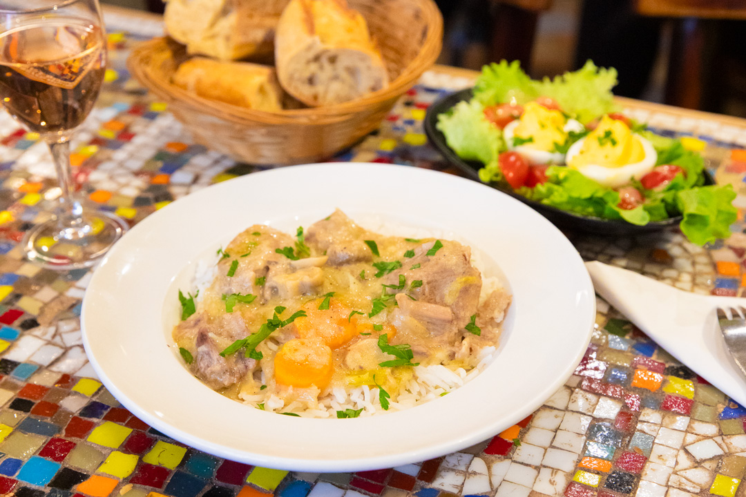 パリの商店街として有名なムフタール通りに佇むビストロ〈Le Verra a Pied〉。昼時には、オーナーのクロード&エンドリカ・ドゥリアン夫妻を慕う常連が集まり、日々大盛況。メニューは季節ごとに変動するが、“フランスの家庭料理”という基本は変わらないので、いつ訪れてもローカルの味が堪能できる。写真は、本日のおすすめ「ブランケット・ド・ヴォー(仔牛のクリーム煮)」。フランスではレストランだけではなく、家庭でもお目にかかるメニューなのだそう。クリーミーなホワイトソースでじっくりと煮込んだ仔牛の肉は、ほろほろと柔らかく、とろけるような舌触りが魅力。濃厚ながらも繊細な味わいで、ジャスミンライスとの相性抜群です。