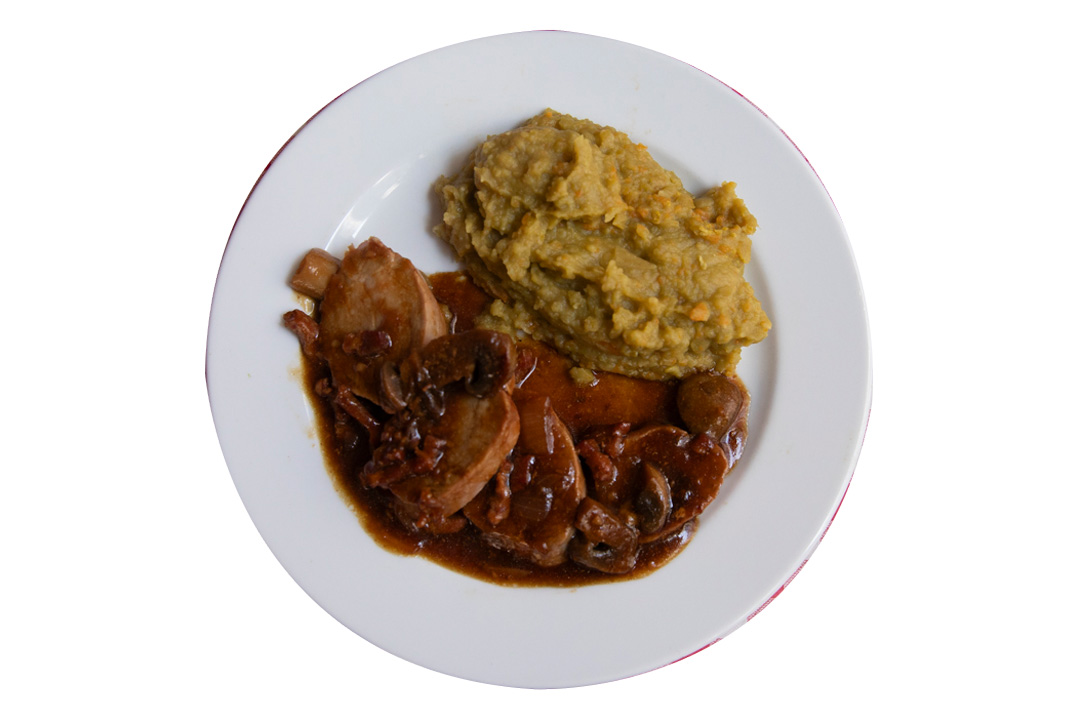 脂肪が少なく柔らかい豚のフィレ肉に、ニンニクが効いたマッシュルームソースをレイヤード。付け合わせのえんどう豆ペーストは箸休めにぴったり。16€