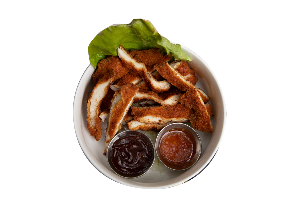 鶏むね肉をサクッと揚げたおつまみにもぴったりなチキンテンダーは、BBQソースorチリソースをお好みでつけて召し上がれ。8€