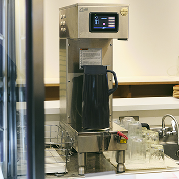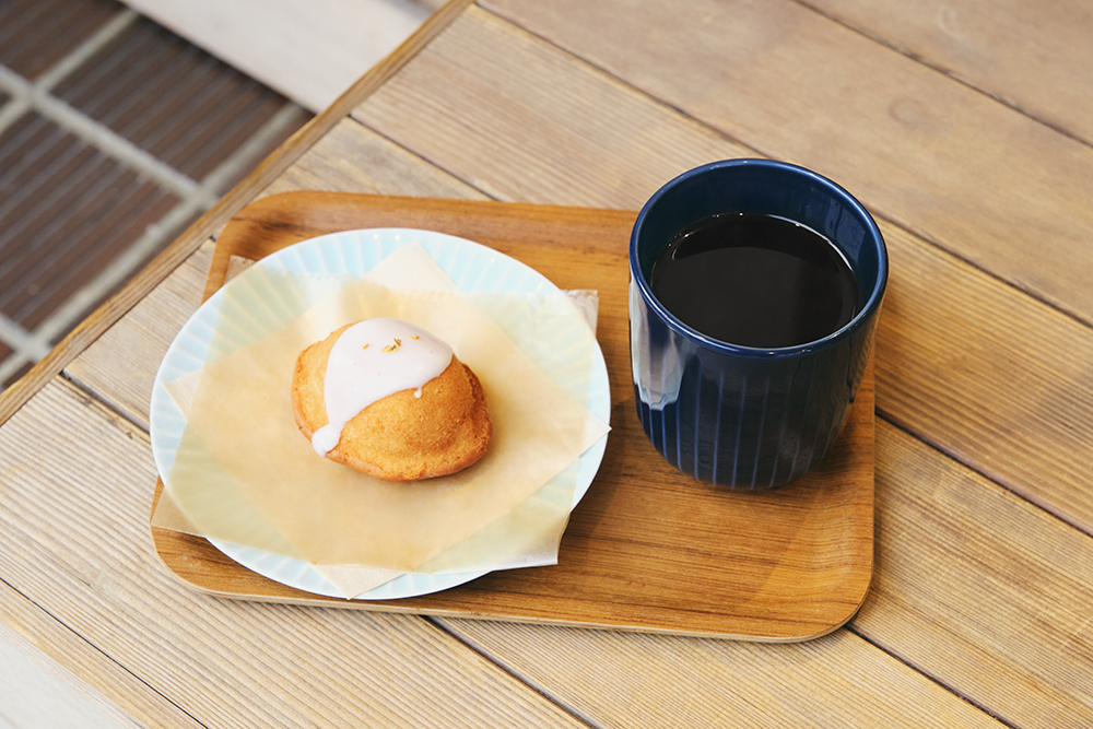 〈夏目坂珈琲〉のオリジナルブレンドは2種類あって、今回オーダーした「バッチブリュー」には「夏目坂ブレンド」が使用されている。宮島のロースター〈伊都岐珈琲〉にて、厳選されたコロンビアとエチオピアの豆を焙煎・ブレンドして仕上げられるこのコーヒーは、柑橘味とリンゴのようなほんのりとした甘みがあり、軽やかでスッキリとしたフレッシュな味わいが特徴。瀬戸内産のレモンを使った「エコレモンケーキ」は、甘さの中にビターな風味も感じられる大人味の一押しスイーツ。