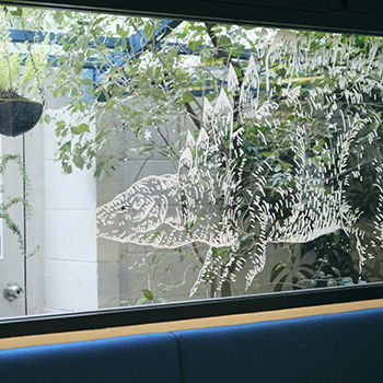 夏目漱石誕生の地、東京・夏目坂の近くにある〈夏目坂珈琲〉。現在、正面ウィンドウは同店の3周年を記念して描かれた下田昌克さんによる恐竜のアートで彩られ、その前にあるテラス席が今回の特等席。「ここで『バッチブリュー』を飲むのがお気に入り」とファージー。「バッチブリュー」とは専用の機械で抽出されるコーヒーのことで、スタッフのウンサンさんいわく、味も安定していて、良質なコーヒーをリーズナブルに楽しめるところがポイントなのだそう。コーヒー豆は、広島県・宮島のロースター〈伊都岐珈琲〉のスペシャルティコーヒーを使用。〈夏目坂珈琲〉オリジナルの「中深煎りブレンド」「夏目坂ブレンド」も〈伊都岐珈琲〉によるもの。オーナーが広島出身なこともあり、コーヒー以外のメニューにも広島の品を取り入れていて、瀬戸内レモンを使った「自家製尾道レモネード」、そのレモネードシロップに漬けたレモンを入れる「エコレモンケーキ」も定番。フードは基本自家製で、グルテンフリーやヴィーガンの品もある。