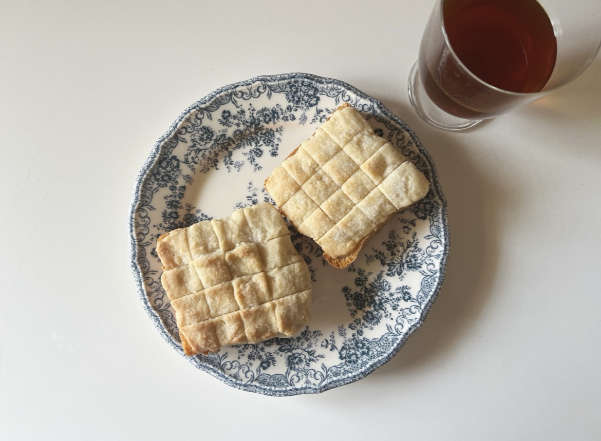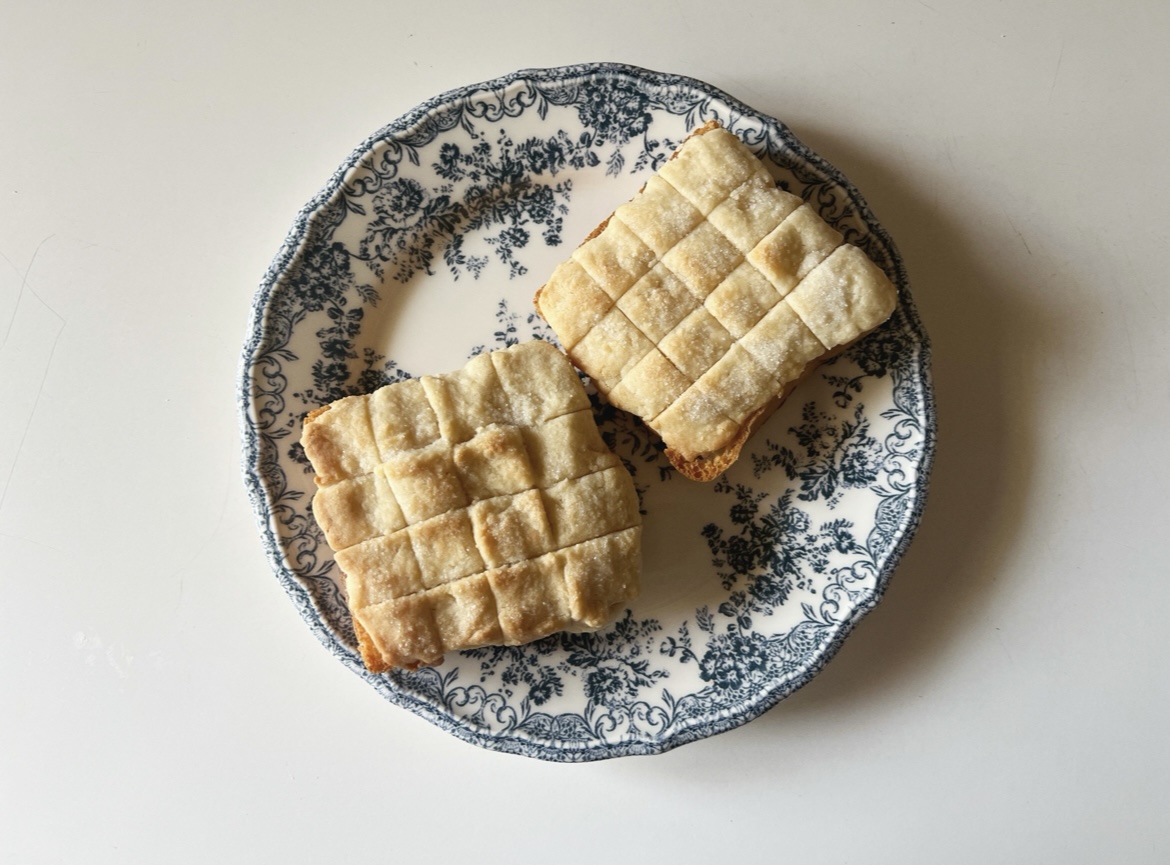 ザクっと食感のクッキー生地に外はさっくり、中はモチっと食感の米粉パンがコーヒーに合います。