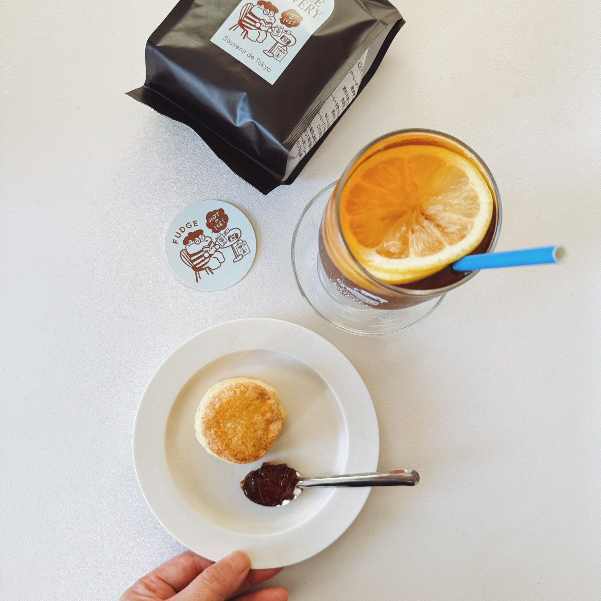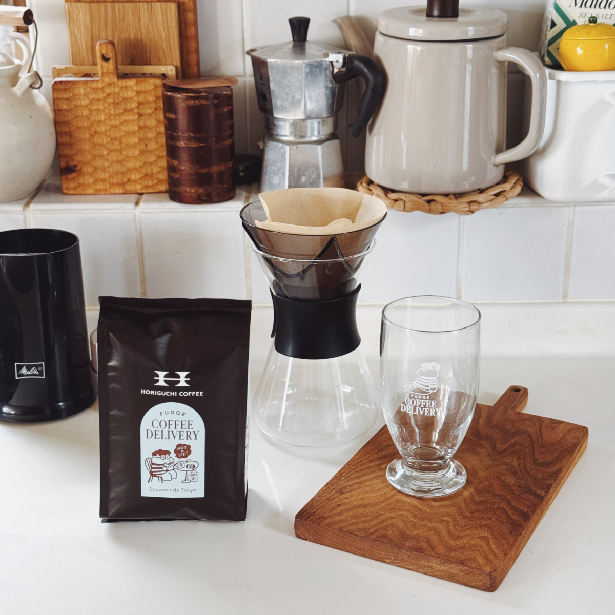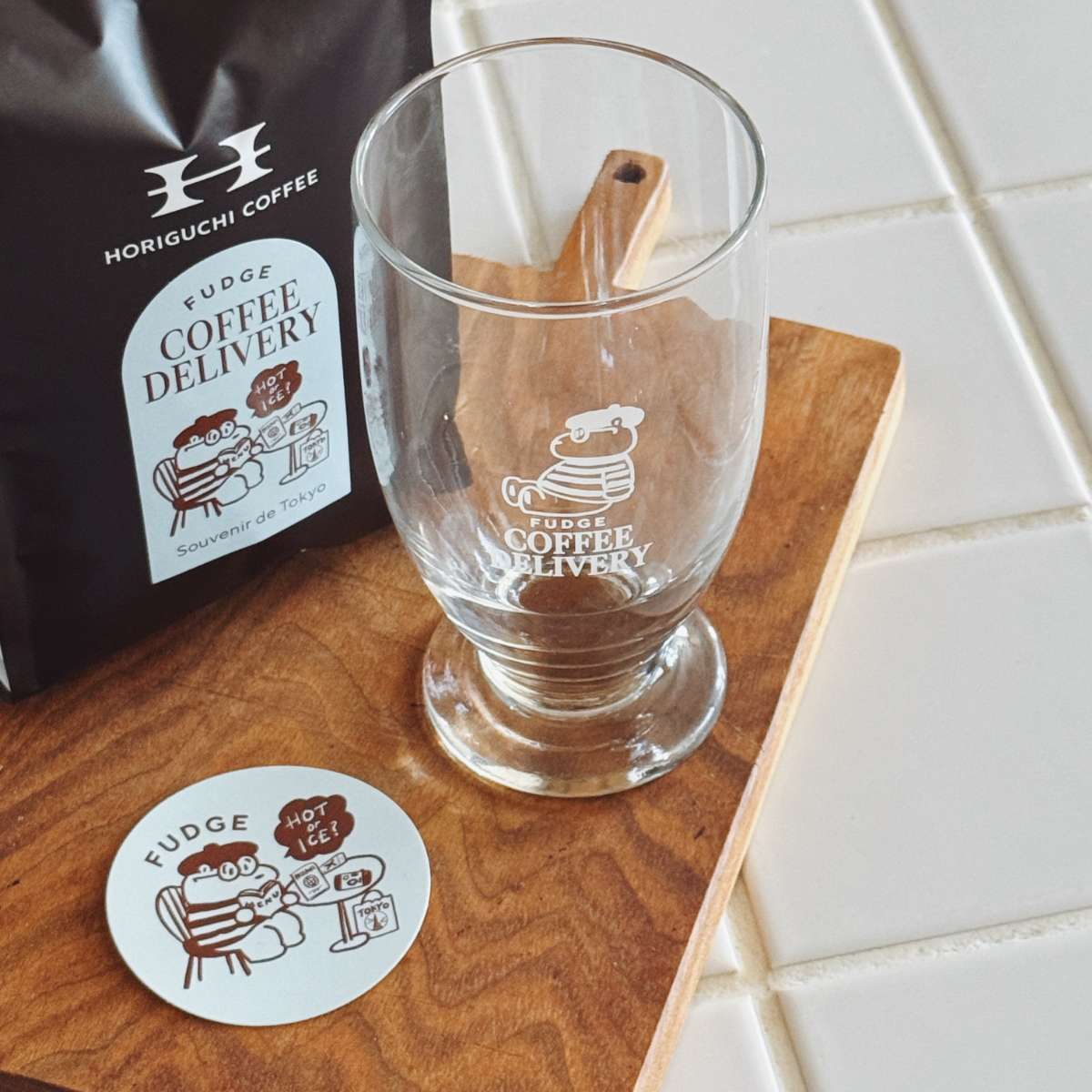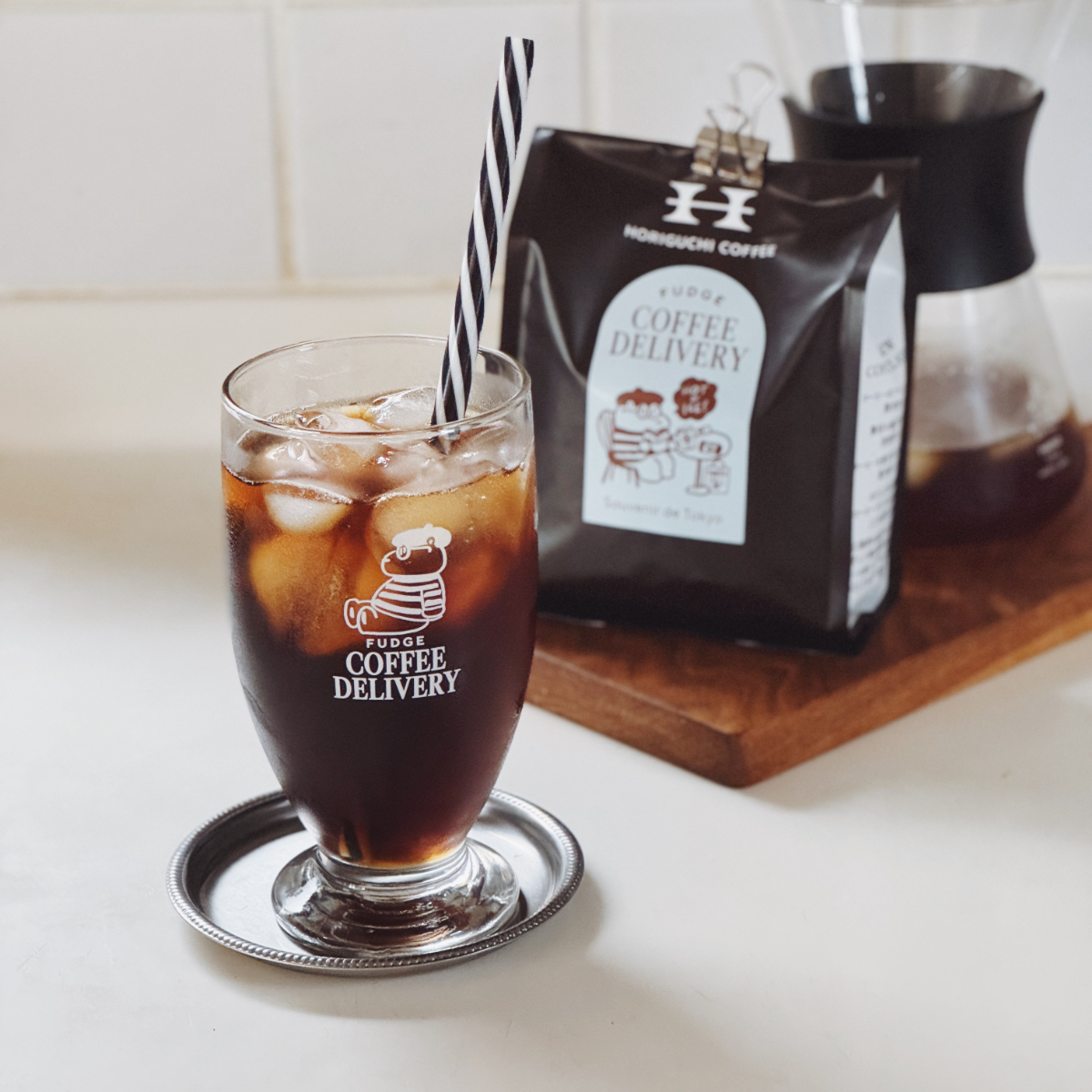 今回のコーヒー豆も、スペシャルティコーヒーの草分け的存在〈堀口珈琲〉がブレンドしてくれたそう。横浜の自社ロースタリーで丁寧に焙煎された定評ある”深煎り”は、香ばしく甘みもありアイスコーヒーにもよく合う豆。愛くるしいファージーのレトロなグラスやステッカーもセットで届きました。