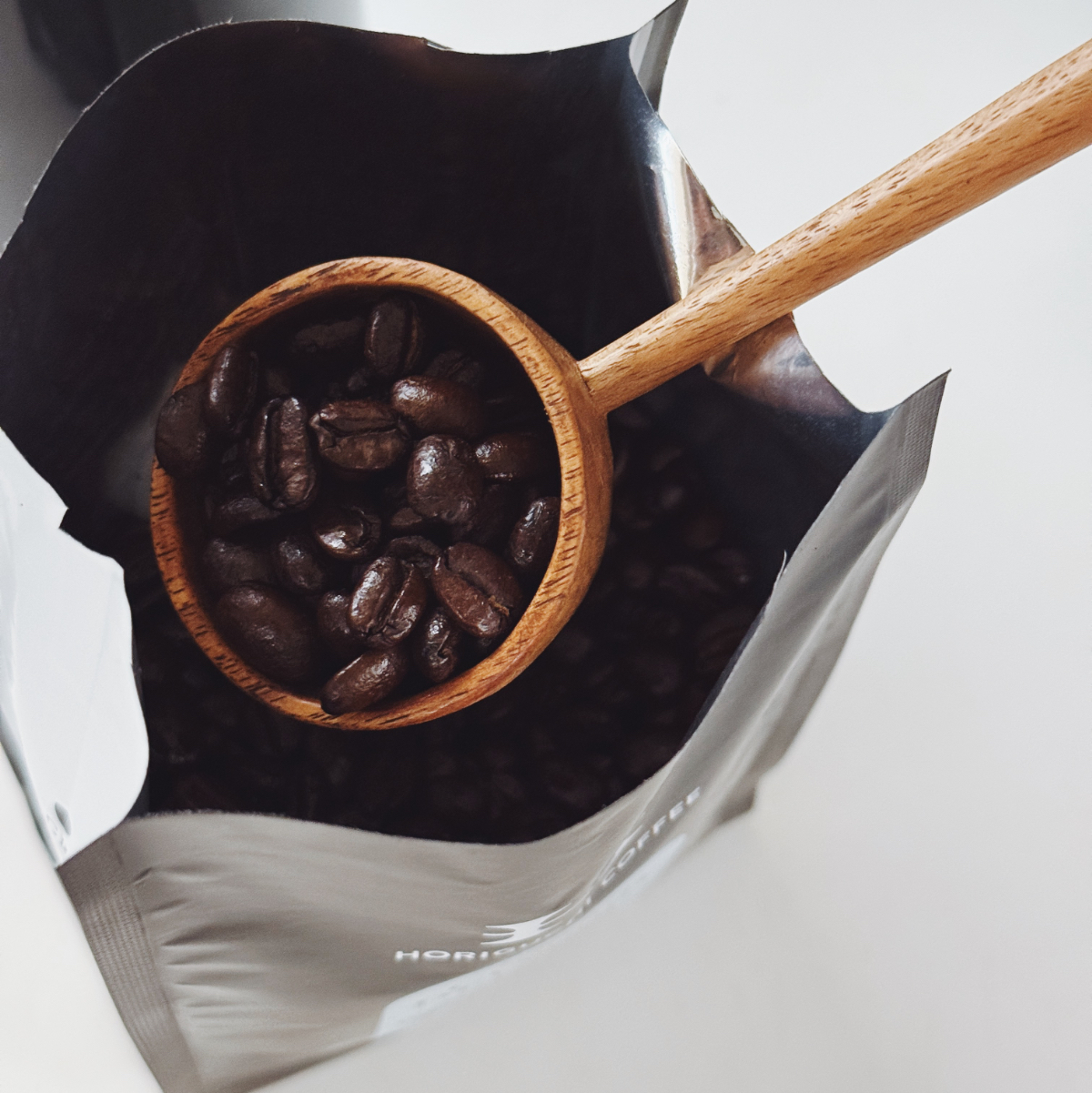 開封すると、いい香り〜。ツヤツヤのコーヒー豆が美しい。