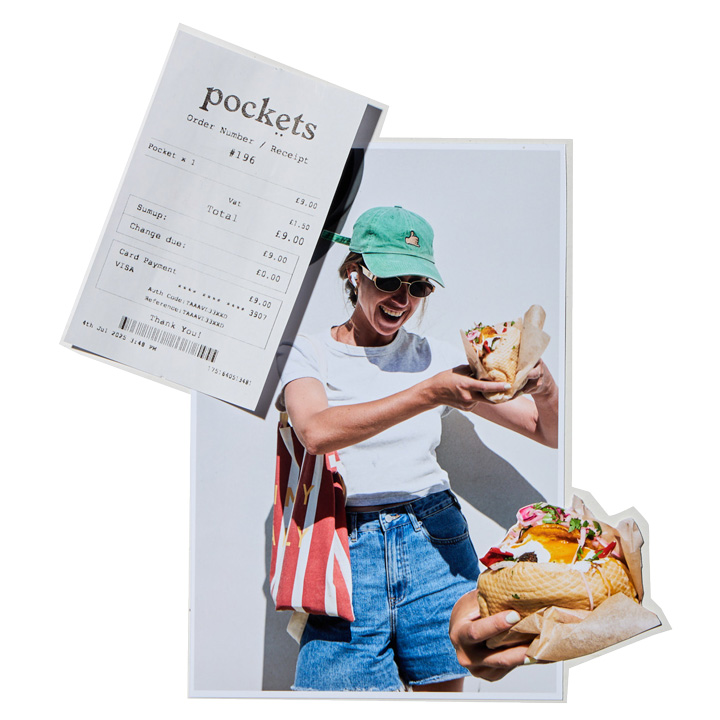 メニューは「ファラフェル・ピタポケット」だだひとつ。それなのに日々行列の絶えないテイクアウト専門店〈pockets〉。石窯で焼いた後、軽く蒸してモチモチに仕上げたピタに、7種のソースと絡めたファラフェル、キャベツ、玉ねぎ、トマト、唐辛子、きゅうり、パセリなどをIN! 仕上げに揚げたポテトをトッピングした、ボリューミーなサンドイッチ。