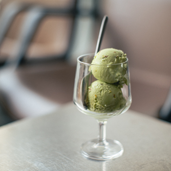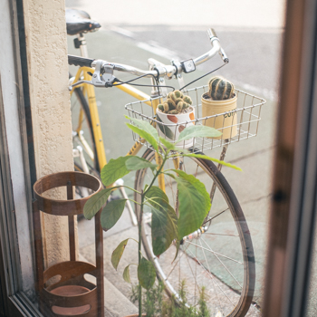 a.スッキリとした味わいの「カフェラテ」(¥700)は、1番人気のドリンク。 b.お客さんからのメッセージやイラストが詰まった落書き帳はお店の宝物の1つ。 c.黄色い自転車はオーナー谷口さんの相棒。これに乗って通勤しているらしい。 d.北欧のヴィンテージ家具やポップな雑貨などでセンスよくスタイリングされた店内。 e.陶芸も趣味だという谷口さん、主に使用されているお皿は自身で手掛けたものだそう。すごい!f.コーヒーと一緒にアイスクリーム(写真は「ピスタチオ」のフレーバー/¥650)を楽しむのも◎。