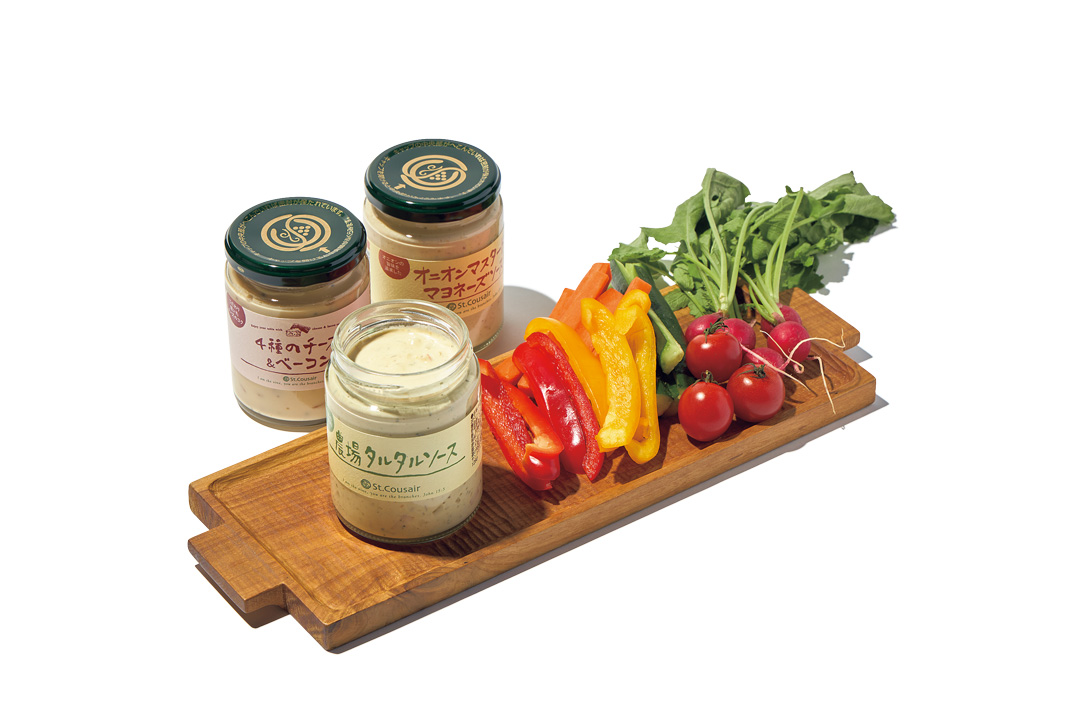 国産野菜のピクルスとゆで卵をたっぷり使った「タルタルソース」。濃厚なエメンタール・カマンベール・マスカルポーネ・ゴルゴンゾーラチーズとベーコンの香ばしさを効かせた「チーズソース」。オニオンのおいしさをギュッと閉じ込めた「マヨソース」。長野発、〈サンクゼール〉の人気ソース3 種は、どれも生野菜と相性抜群。