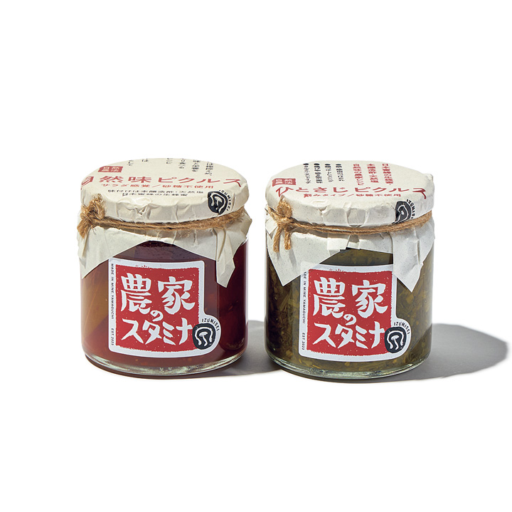 サプリより美味しく、野菜より手軽に栄養が摂れる〈農家のスタミナ〉のピクルス。左は、時間をかけて天日干しした自然農法のイタリアントマト。右は、軽い天日干しで旨みを凝縮させたみじん切りのほうれん草。甘さはハチミツのみ! “食べるお酢”感覚で、料理のトッピングにもおすすめです。