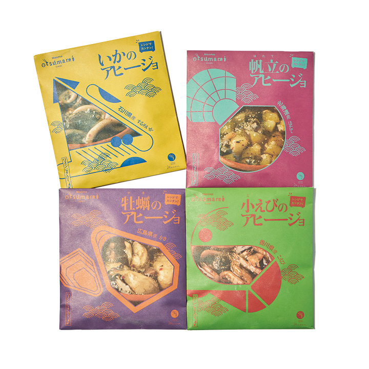 イタリア産のエクストラバージンオリーブオイルに、香川県産のニンニク、国産ブラウンマッシュルーム、7 種のスパイスを合わせ、厳選した国産魚介をそれぞれ加えた本格アヒージョ。電子レンジで約3分温めるだけで完成する手軽さも特筆すべき点。目を引くカラフルなパッケージも素敵。