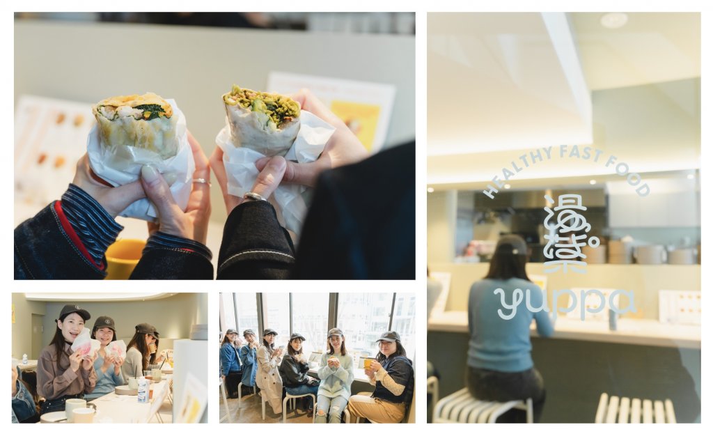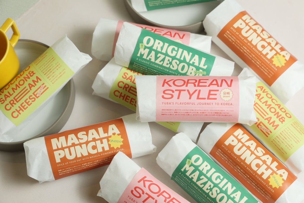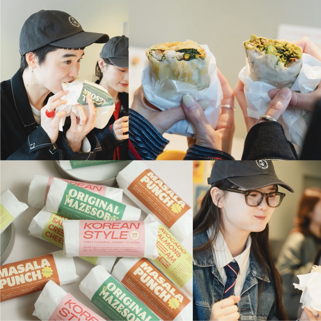 お腹を空かせた一同がお昼どきに訪れたのは、2026年1月にオープンした〈yuppa 表参道店〉。京都の生湯葉で沢⼭の具材をぐるっと巻いた、高タンパクでヘルシーなファストフードを提供しています。