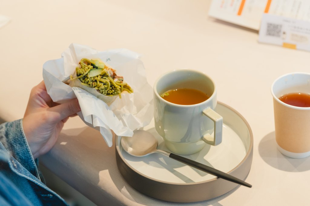 オーダーの際には、ドリンクとスープもセットでぜひ(フルセット¥550)。トマトと昆布だしがベースの野菜スープは、味噌汁とコンソメスープのちょうど中間に立つような存在で、どのラップサンドにも抜群に合います。福岡産の「奥八女ほうじ茶」や、中国茶「雲南ジャスミン紅茶」など、こだわりのドリンクはランプサンドとのペアリングを楽しむのがおすすめです。