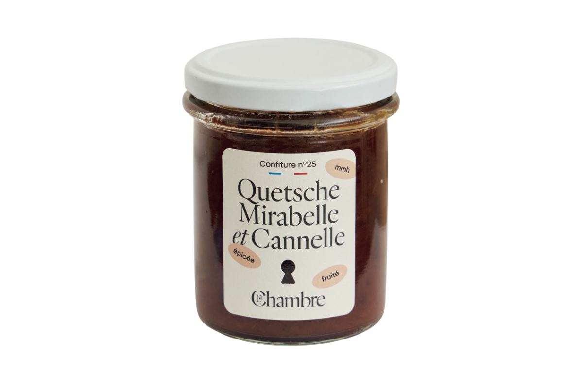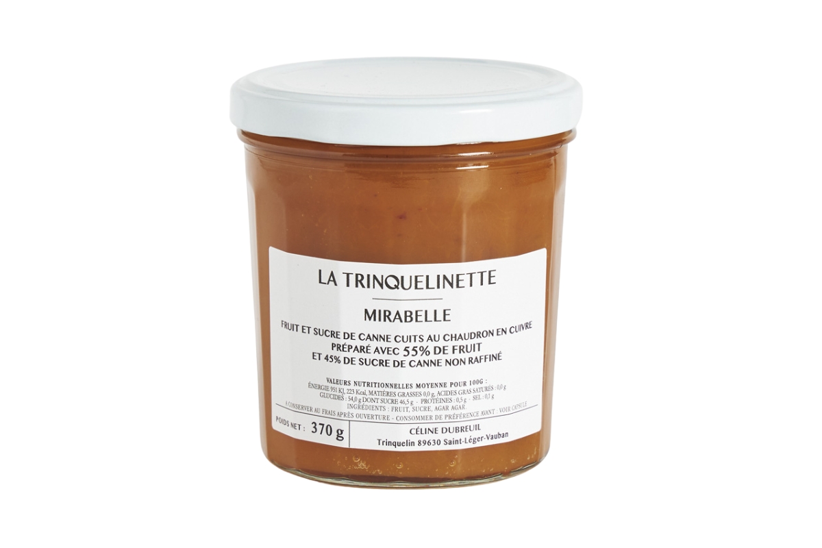 ゴロッとした果肉を感じられる、贅沢なコンフィチュール。ロレーヌ地方の名産であるミラベルとプラム(すもも)をふんだんに使っていて、フルーツ含有率は約61%! ミラベルの上品な甘さを、シナモンがやさしく引き締める、奥行きのある味わい。[200g]7.9€