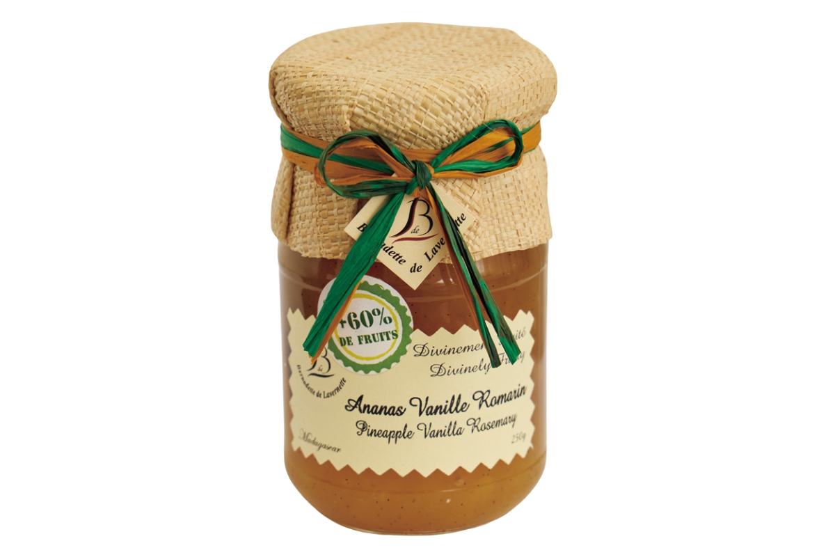 独創的なフレーバーが人気の《ビー・ド・エル》からは、パイナップルとローズマリーとバニラのジャムを。パイナップルのトロピカルな甘さに、ローズマリーの爽やかな香りが重なるモダンな味。まろやかなバニラと、スパイスの余韻もたまらない。[250g]6€