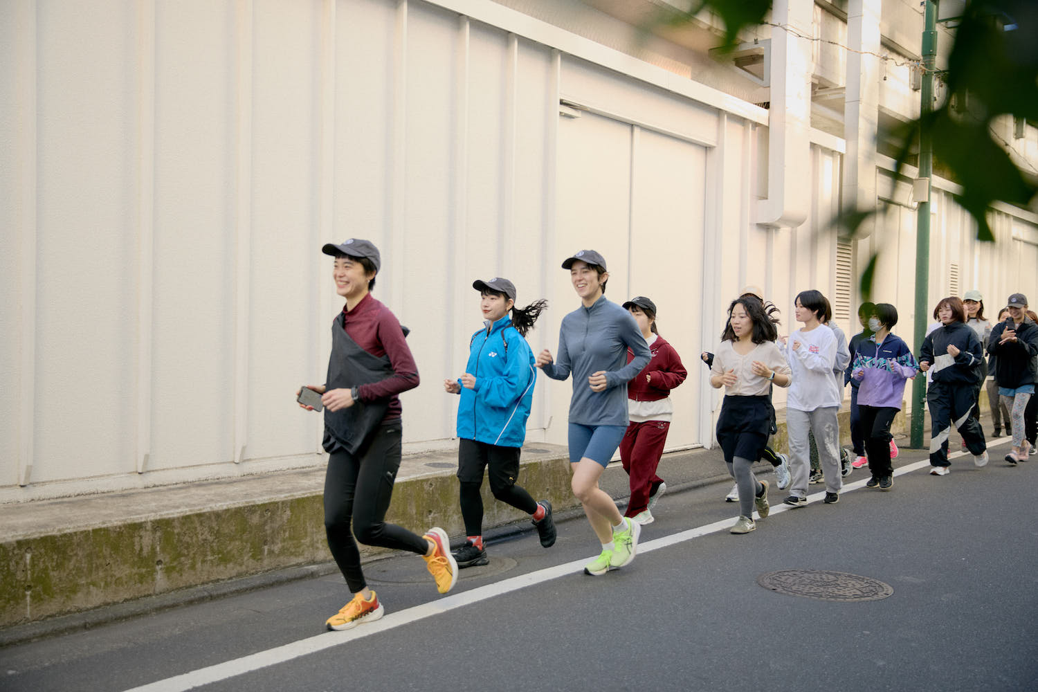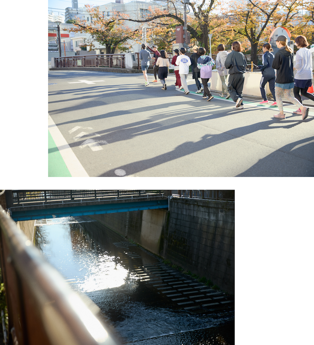 まだ人がまばらな景色が新鮮な、朝の中目黒。ほとんどがお1人での参加ですが、みなさん楽しそうに隣の方とお話ししながら走っているのが印象的。線路沿いの道を進みながら、「ここのお店おすすめだよ」なんて話す声が聞こえてきます。