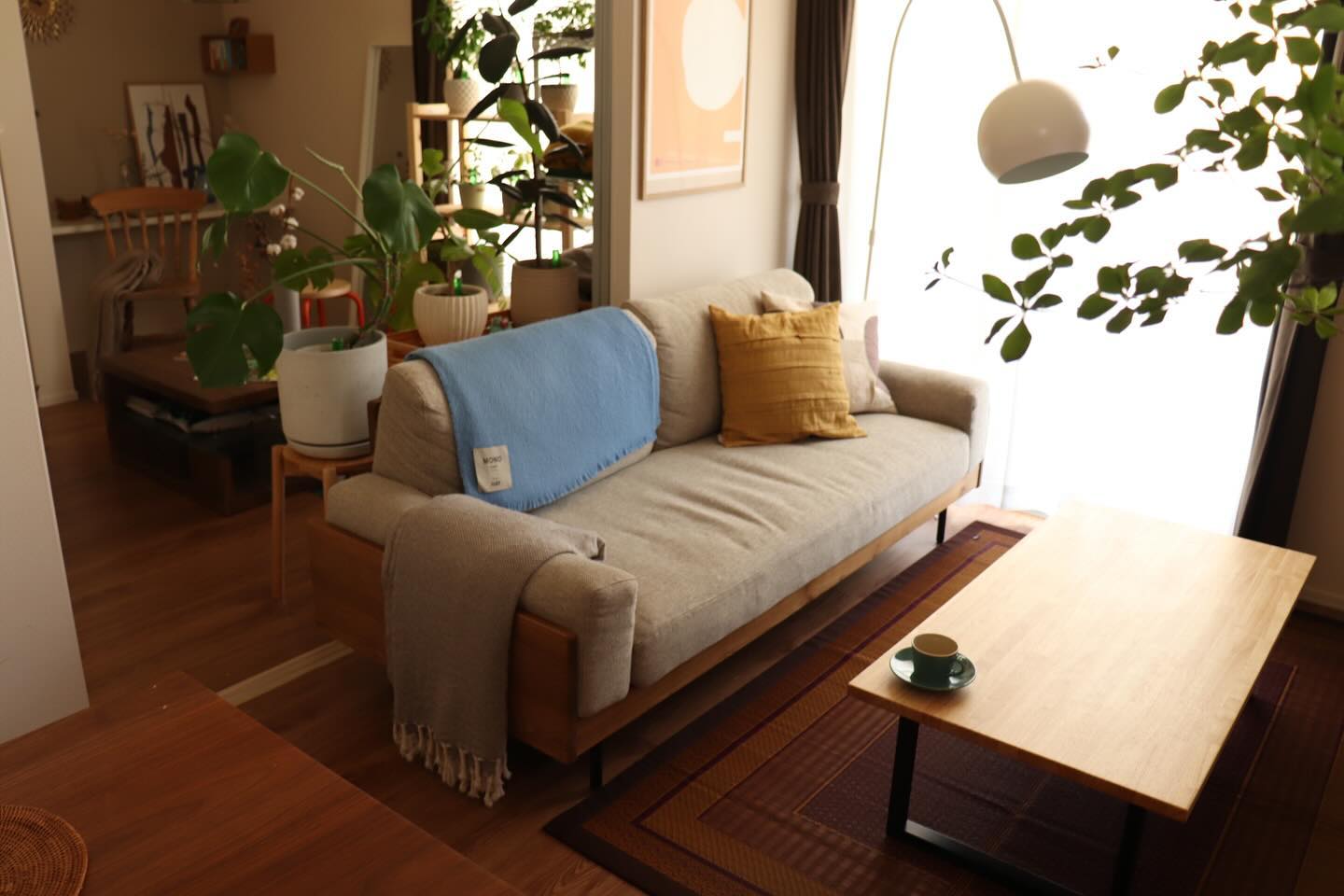 脚が黒のものを選び、床から浮かせて見せることもポイントだそう。ソファは unico の TREL 、ローテーブルはKANADEMONOでサイズオーダーしたもの。