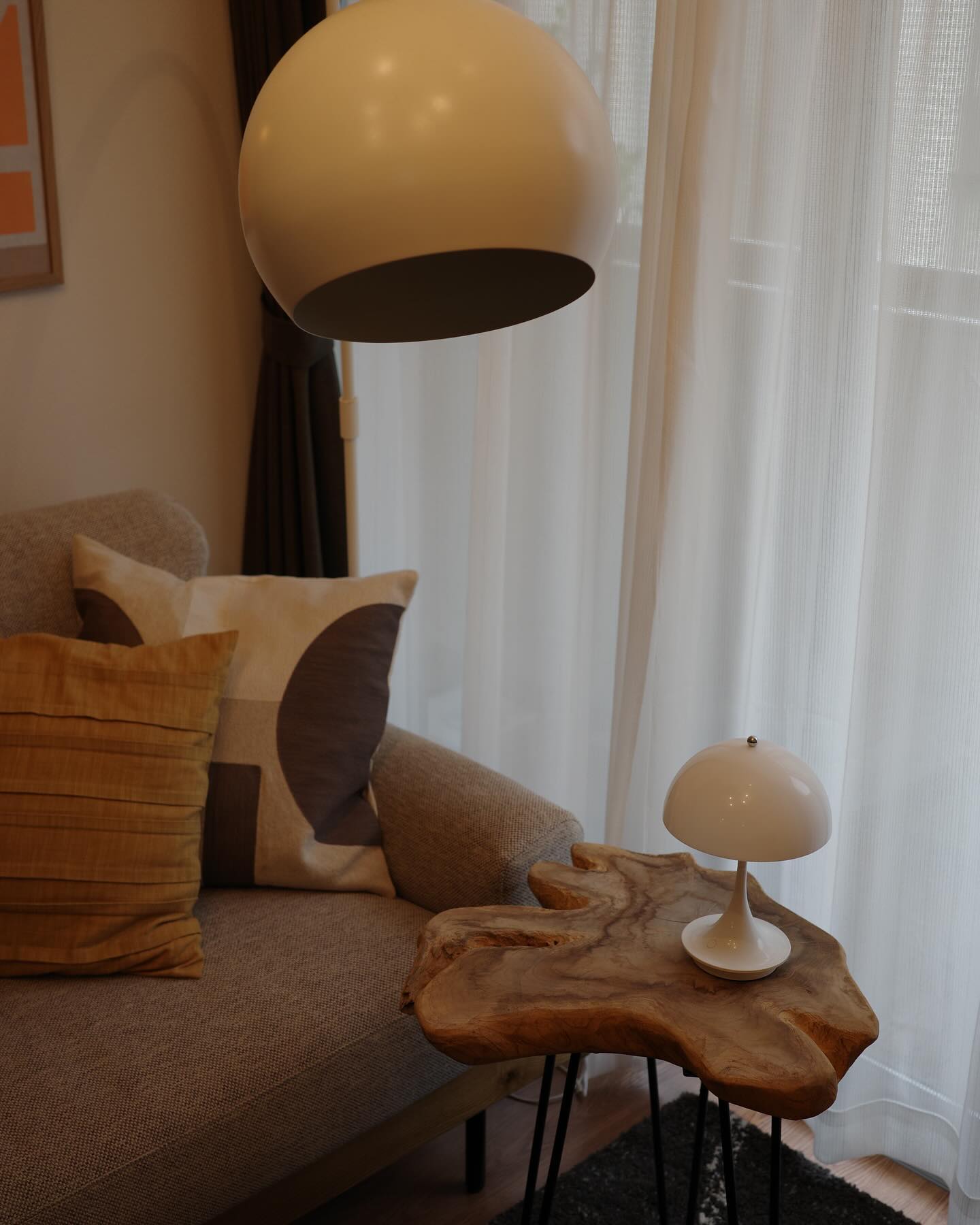 「一点もので、ひとつひとつ顔が違うことに惹かれました。ソファに座りながらお酒やコーヒー飲んだりにすごくちょうどよくて、子どもが生まれたばかりなんですけど、ここににミルクやガーゼを置いたり、今一番、日常的に使っている家具です」