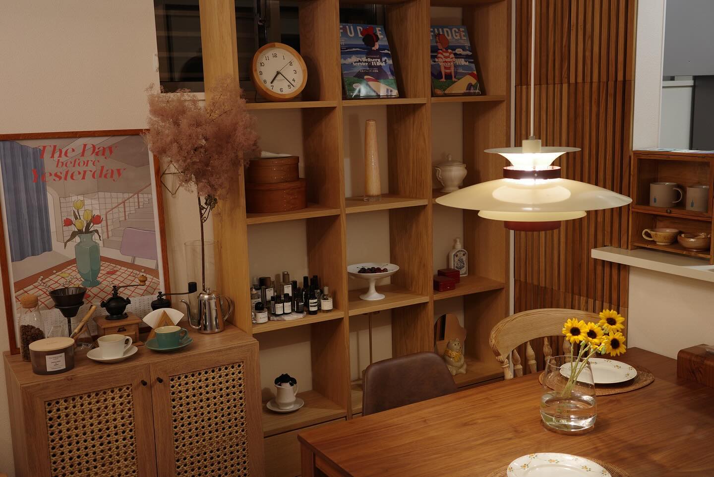 ダイニングの背面に、無印良品のスタッキングシェルフを用いて高さのある「見せる収納」を置いたことで、収納の少なさをカバーしていらっしゃいます。