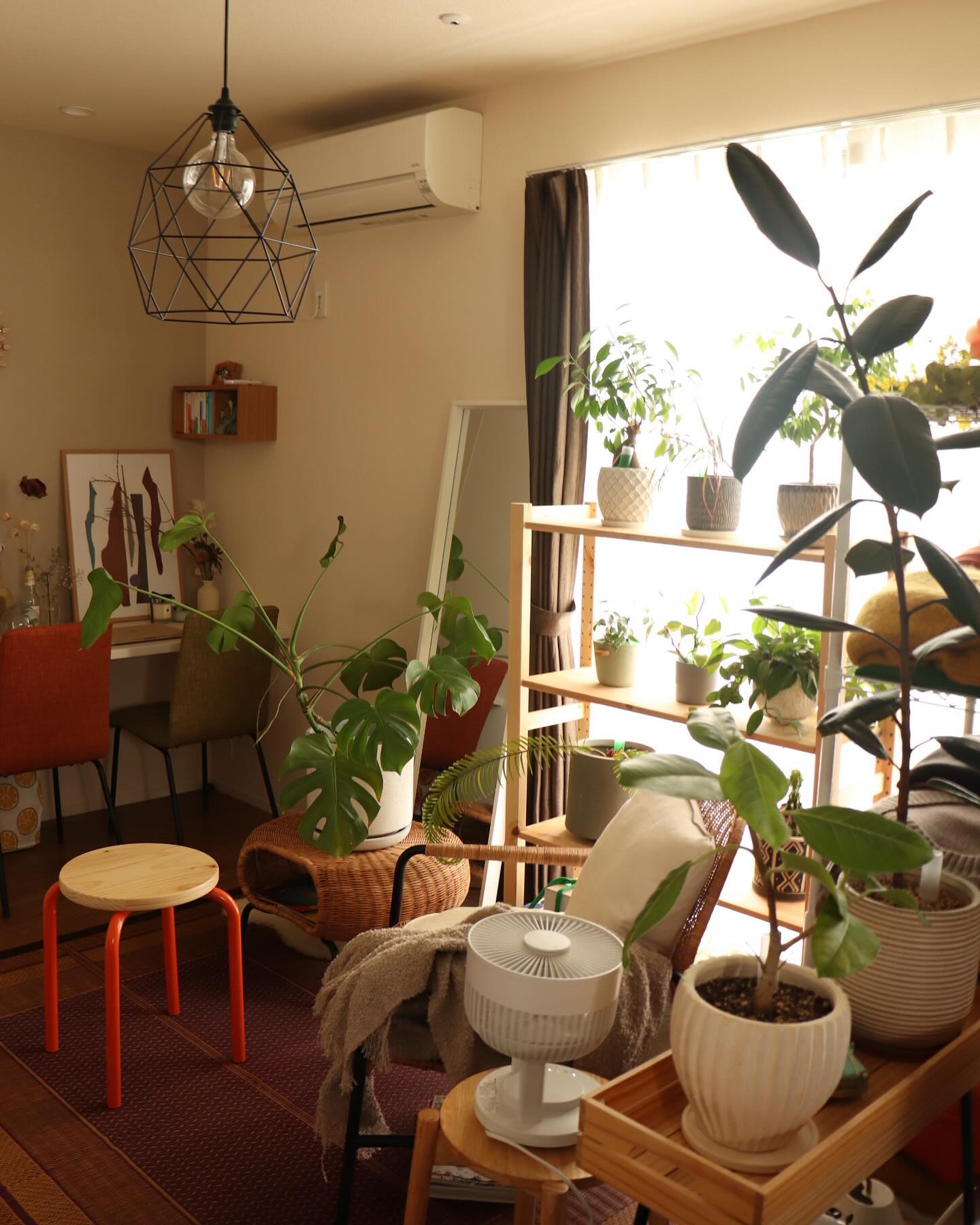 リビング横のひと部屋は、書斎兼、植物のお部屋。窓際の光がよくあたる場所にたくさんのグリーンが並んでいます。