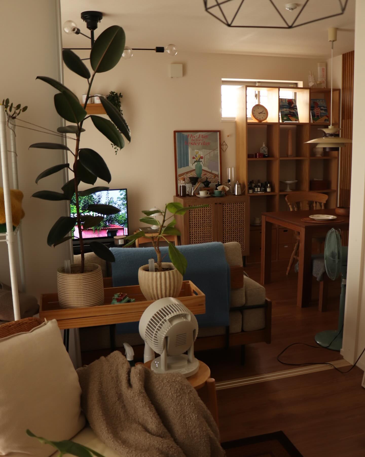 10畳縦長のLDKに、あえて「見せる収納」を置いて、好きなものに囲まれたリラックスできる空間に。たくさんものがあっても統一感があり整って見える、三人暮らしの2LDKを拝見しました。