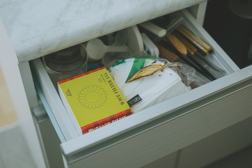 必要以上に作業台が散らからないよう、収納面でもカウンターは大活躍。上段にはコーヒーフィルターなどの小物が、下段にはコーヒータイムのお供であるお菓子が保管されていました。