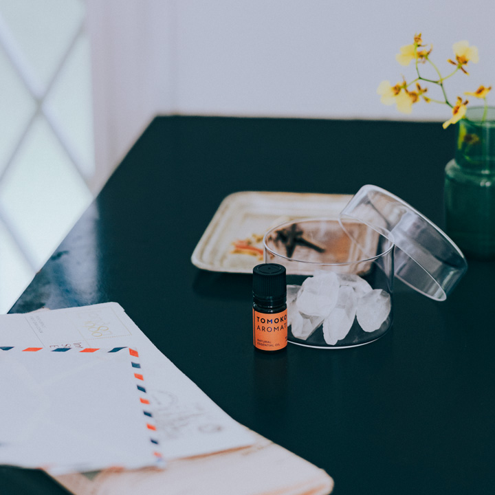 水晶に精油を数滴垂らせばほのかに漂い空間をグレードアップ。《木村硝子店》の美しい容器にもうっとり。