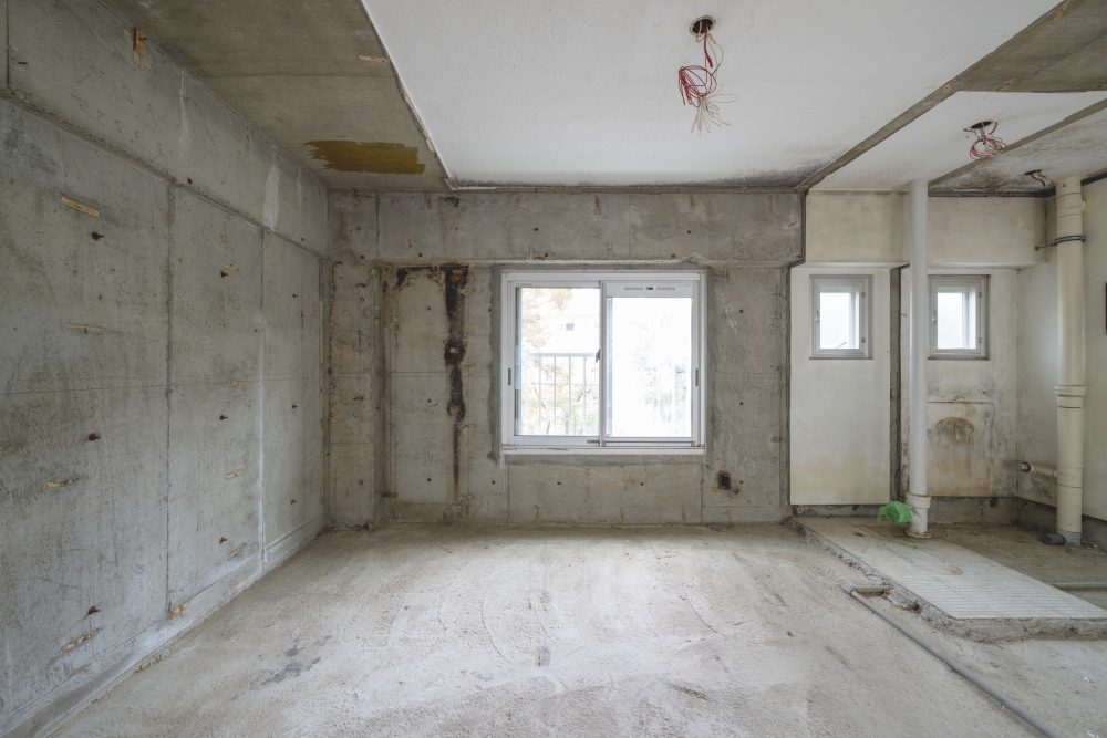 上はリノベーション前の写真です。比較的、きれいな状態でしたが、間取りが細かく区切られて使いにくさも。下の写真は、既存の壁や設備などを解体し、スケルトン状態にしたものです。