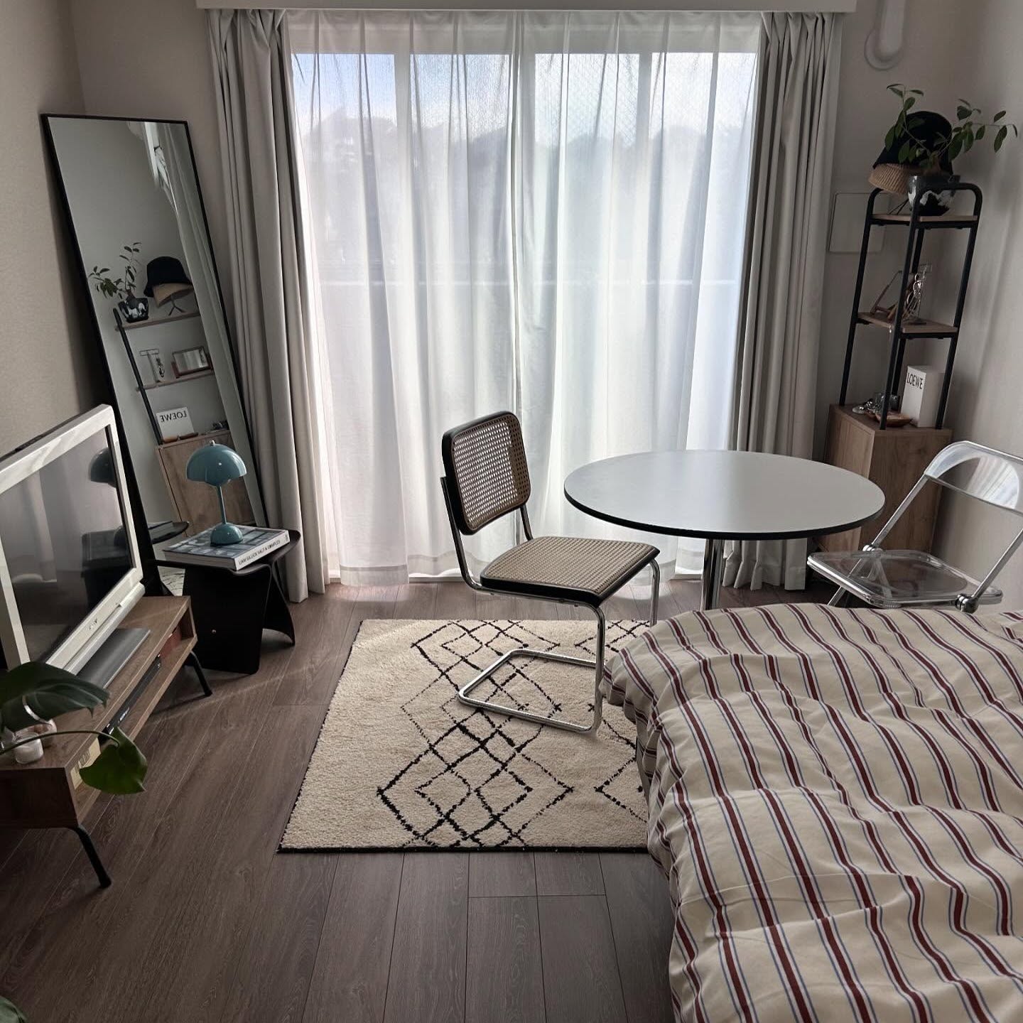 もうひとつ、「買ってよかった」と教えてもらったのは、左側のクローゼットの前に置かれたカフェテーブル。椅子のデザインとお揃いで、小さなお部屋でもじゃまにならないサイズ感が絶妙です。クローゼット前に置いたことで立ったまま作業をしたり、ちょっとものを置いたりに便利なのだそう。