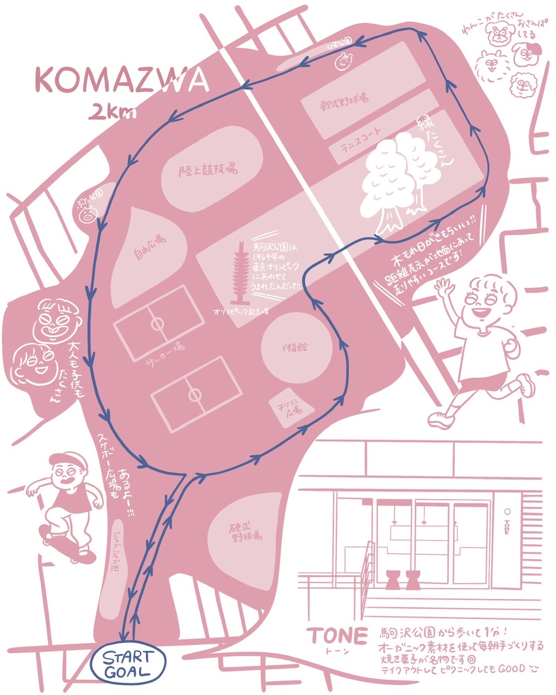 今回は駒沢オリンピック公園の向かいにあるカフェ〈TONE〉で集合し、公園のジョギングコースを1〜2周する全長2〜4kmのコースです。