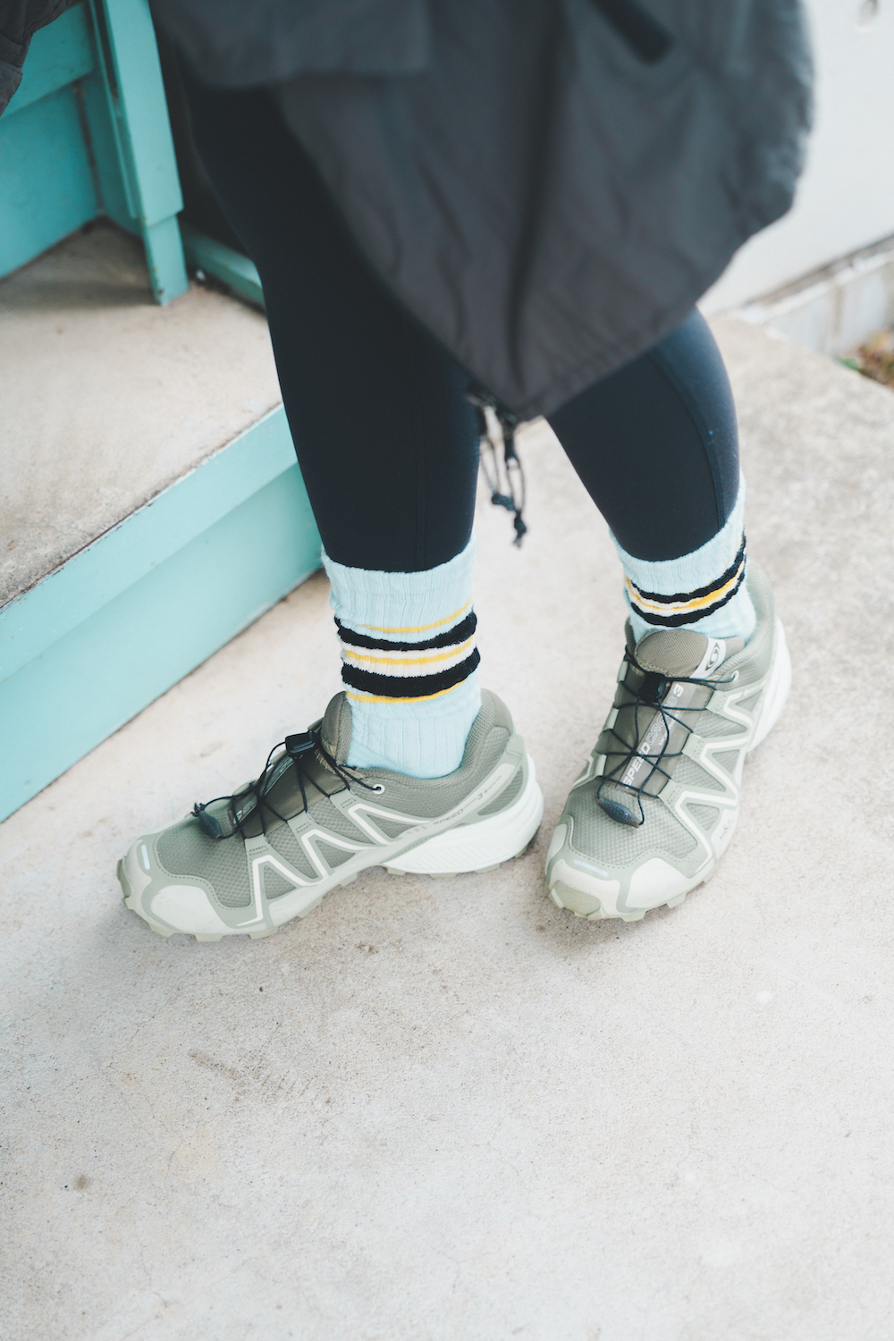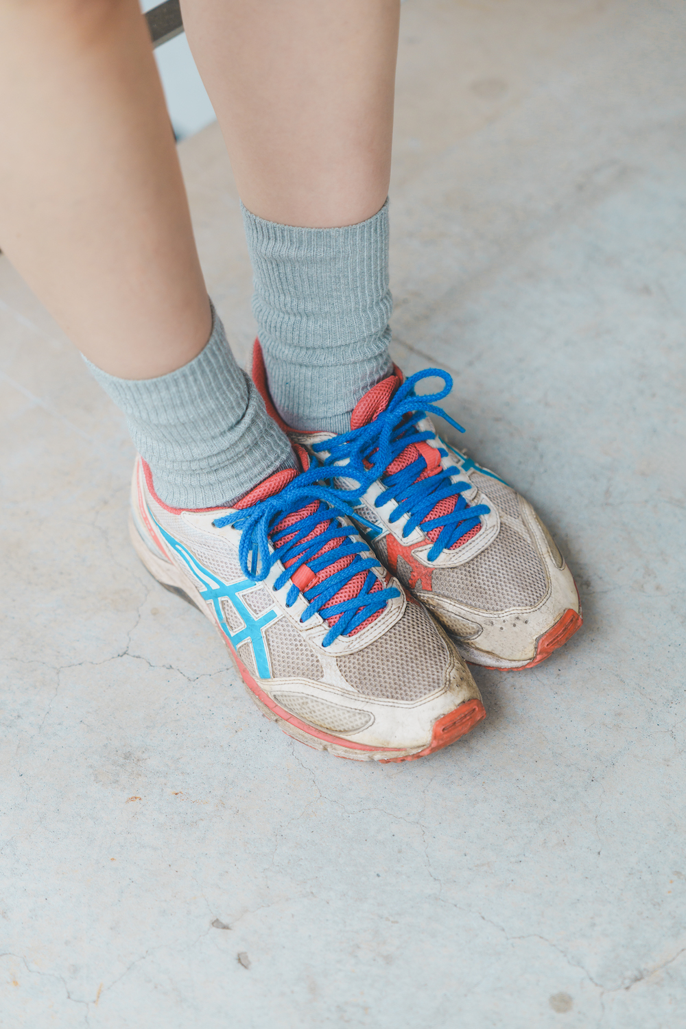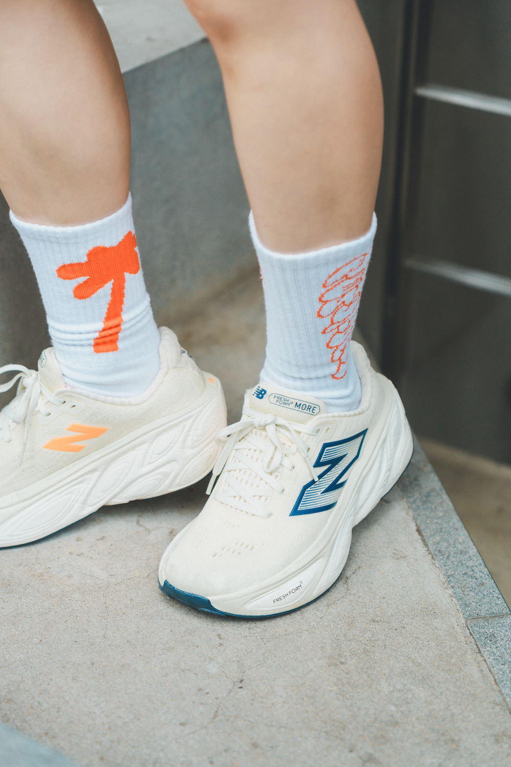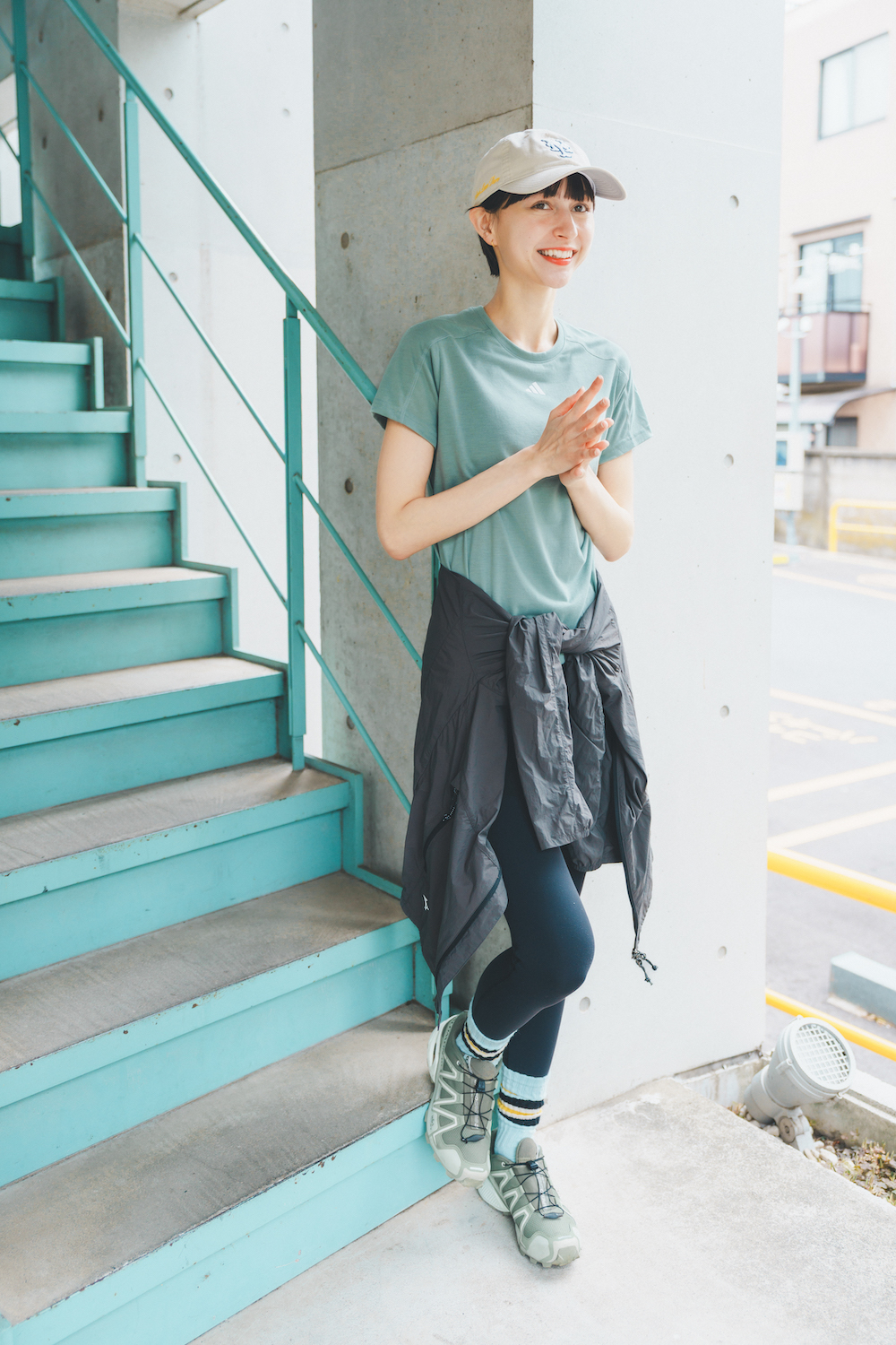 FUDGEランニング部1回目にも参加してくれたモデルのソフィーさん。ランニングは日課。「今日の主役は足元!お気に入りの《ネイム》のラインソックスでアクセントを加えました。Tシャツや足元のトーンを揃えてまとまった印象に」
