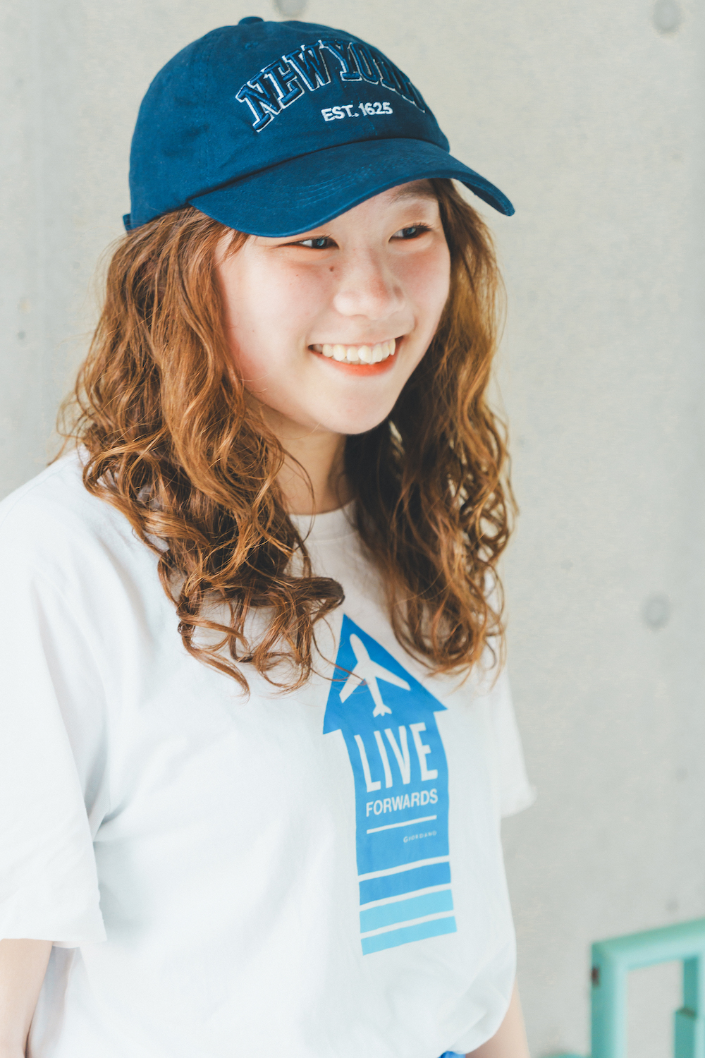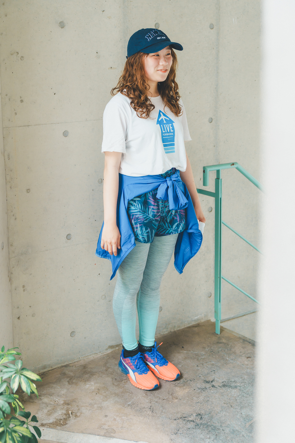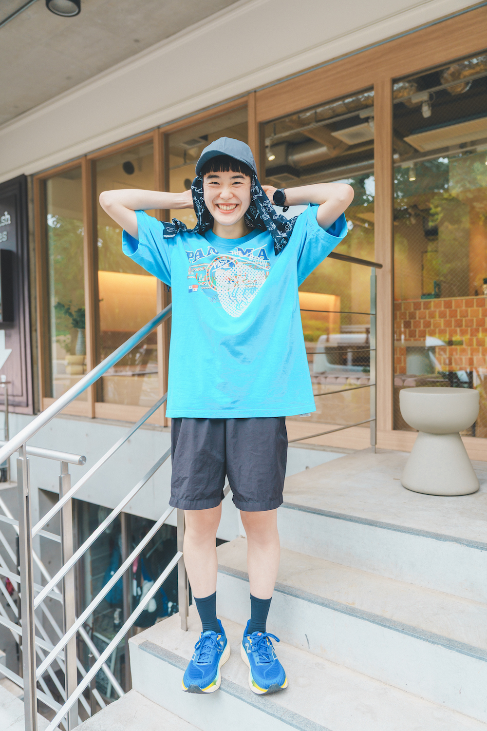 ウェーブヘアが素敵な大学生。2日に1回ほどのペースでランニングを楽しんでいそう。「今日のコーディネートのテーマは、大好きなブルー。特に父からのおさがりのプリントTシャツはお気に入りです。学生なのでボトムスはプチプラな《ジーユー》で」