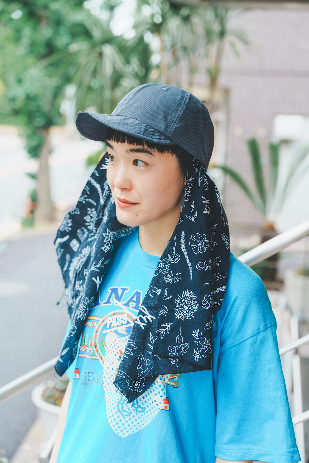トップス/PASS THE BATON、パンツ/FamilyMart、バンダナ/Sanity、ハット/Nicetime Mountain Gallery、ソックス/feetures、シューズ/New Balance