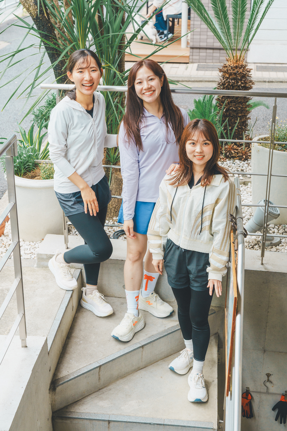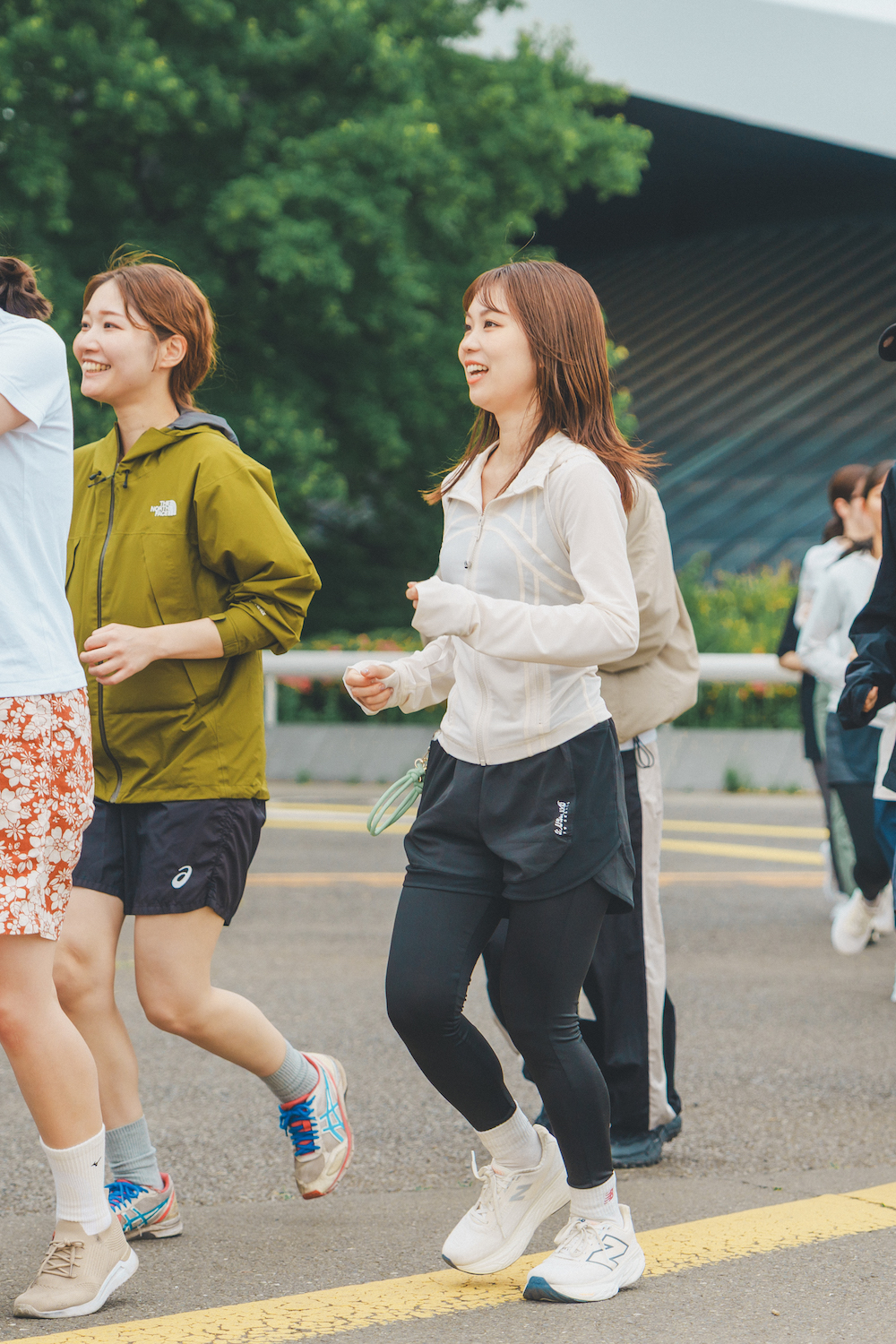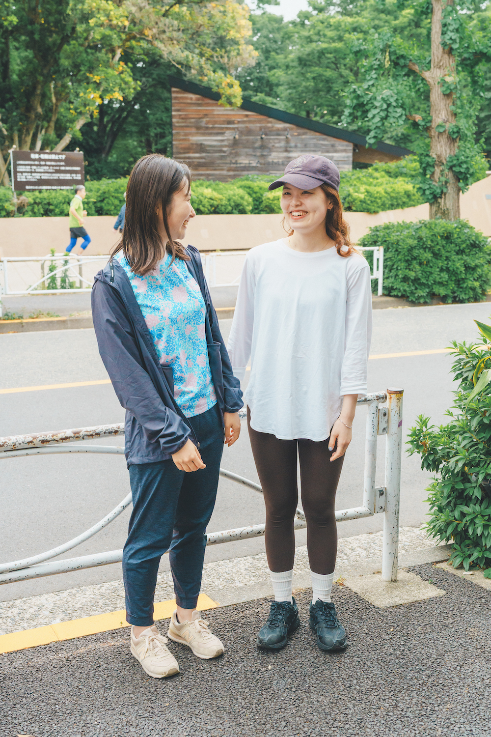 週に1回ほどランニングを楽しんでいるなつみさん(右)。まなさんの誘いで初参加!「お気に入りの《ニューバランス》のシューズを主役に。全体的にモノトーンでまとめて大人っぽく仕上げました」