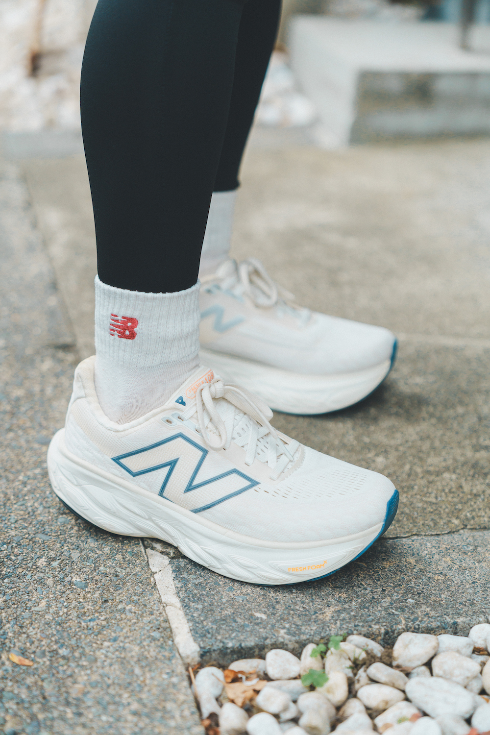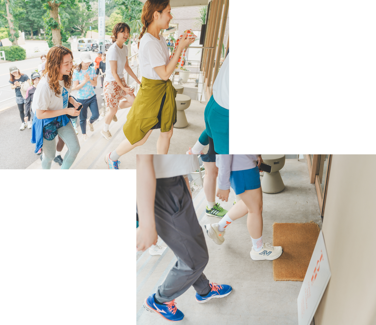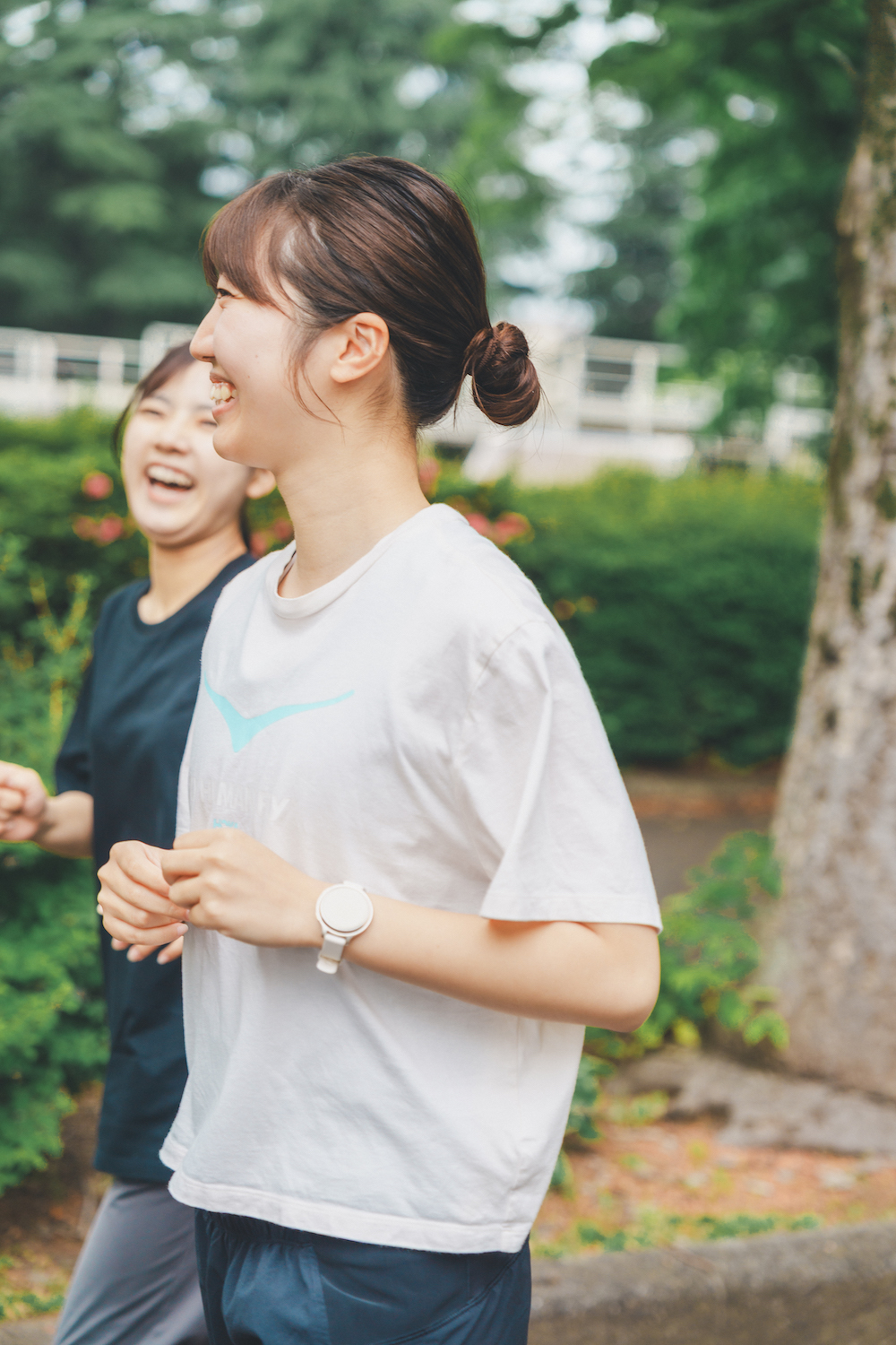 週に1回ほどランニングを楽しんでいるなつみさん(右)。まなさんの誘いで初参加!「お気に入りの《ニューバランス》のシューズを主役に。全体的にモノトーンでまとめて大人っぽく仕上げました」