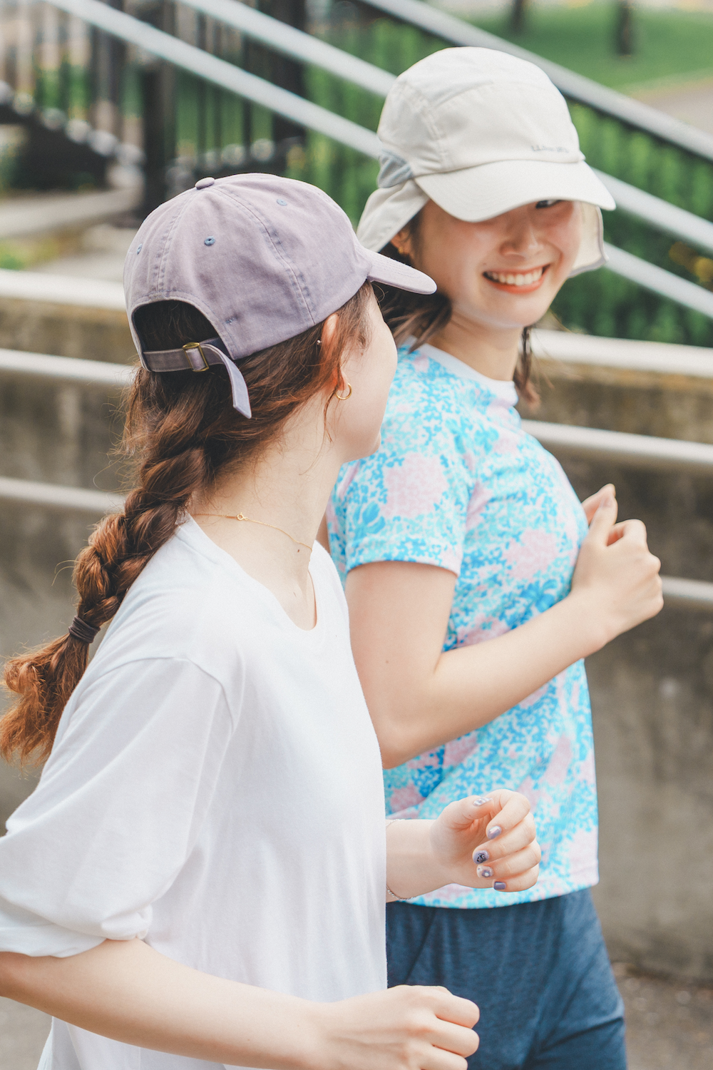 ふだんはヨガがメイン。たまにランニングも取り入れているというはるかさん(右)。「新調したばかりの《ルルレモン》のブラウンのタイツを主役に。パープルのキャップで差し色を加えました」