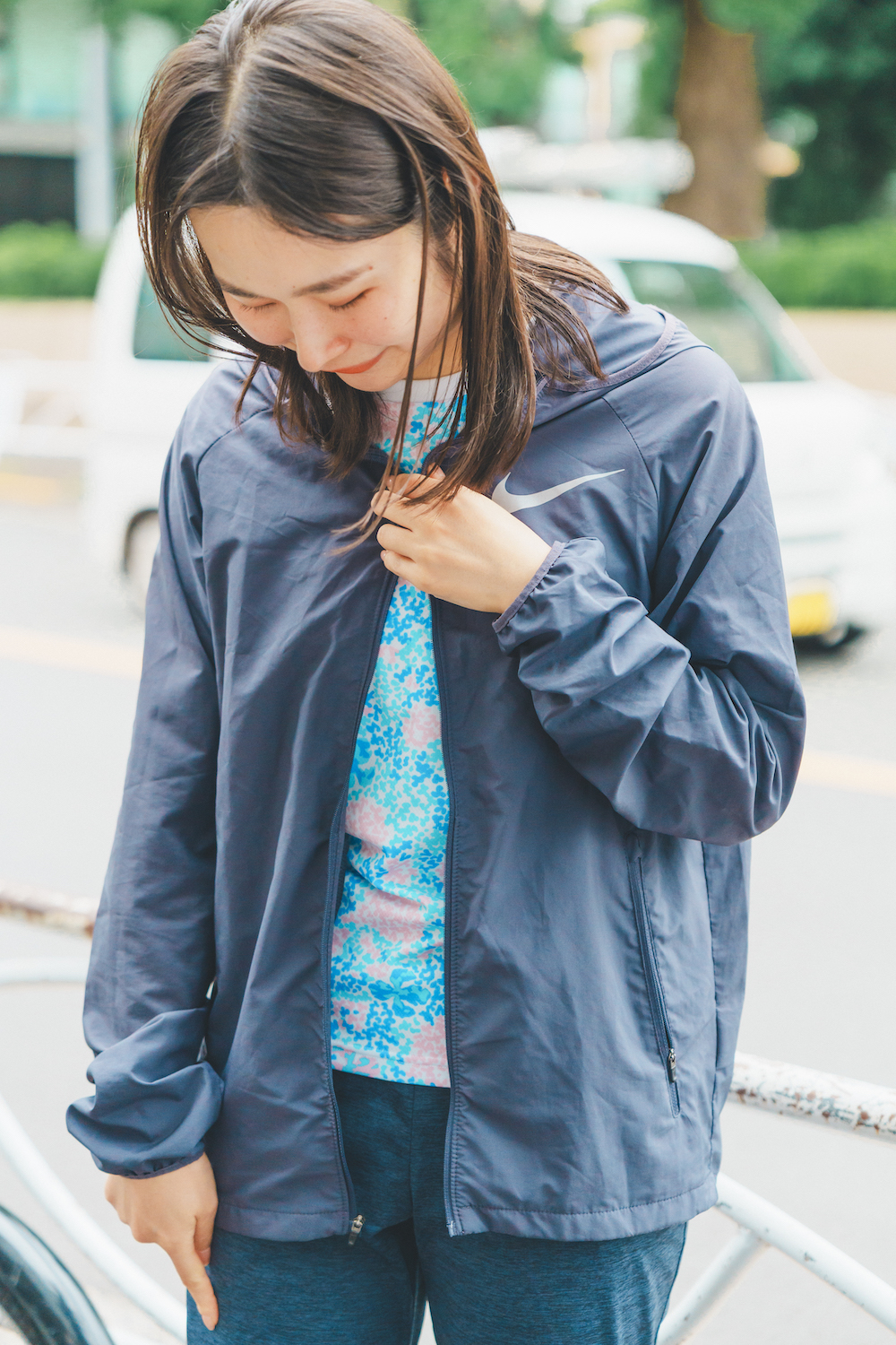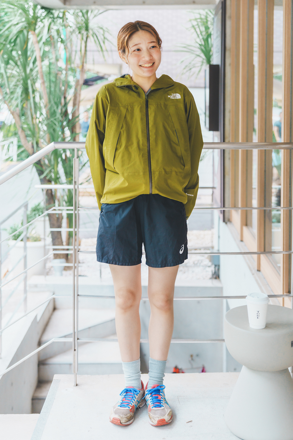 気分転換にランニングを取り入れているというあかりさん。「《アシックス》のシューズはお気に入りでかなり履き込んでいます。足元を主役にしたくて、それ以外はシンプルに。ゴアテックスのジャケットとパンツは汗を外に逃がしてくれるので、ランニングの時に重宝しています」