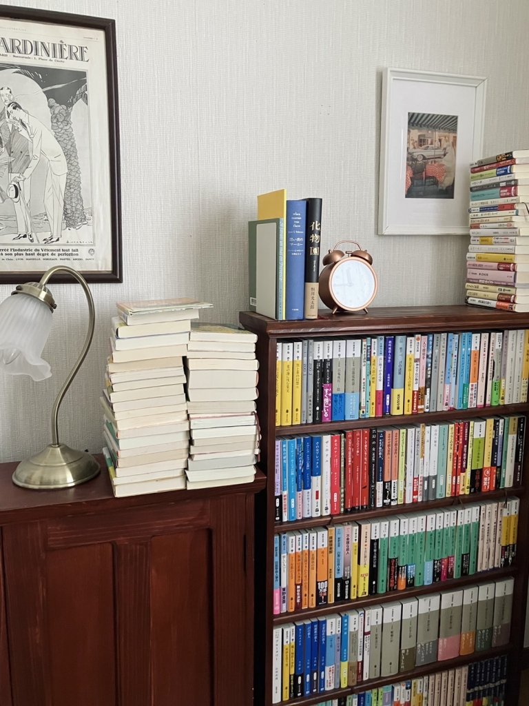 「文庫本を取りやすくするために、指が入る隙間も考慮したサイズの本棚を1年ほど前に作りました。縦横幅のサイズ感はしっかりと測って、装飾などは感覚で決めていきましたね。扉がある棚には漫画や絵本を収納しています。ご覧の通りすでに収まりきっていないのですが(笑)、上の段はこれから読むもの、下の段はすでに読んだものを作者別に分けて収納しています」