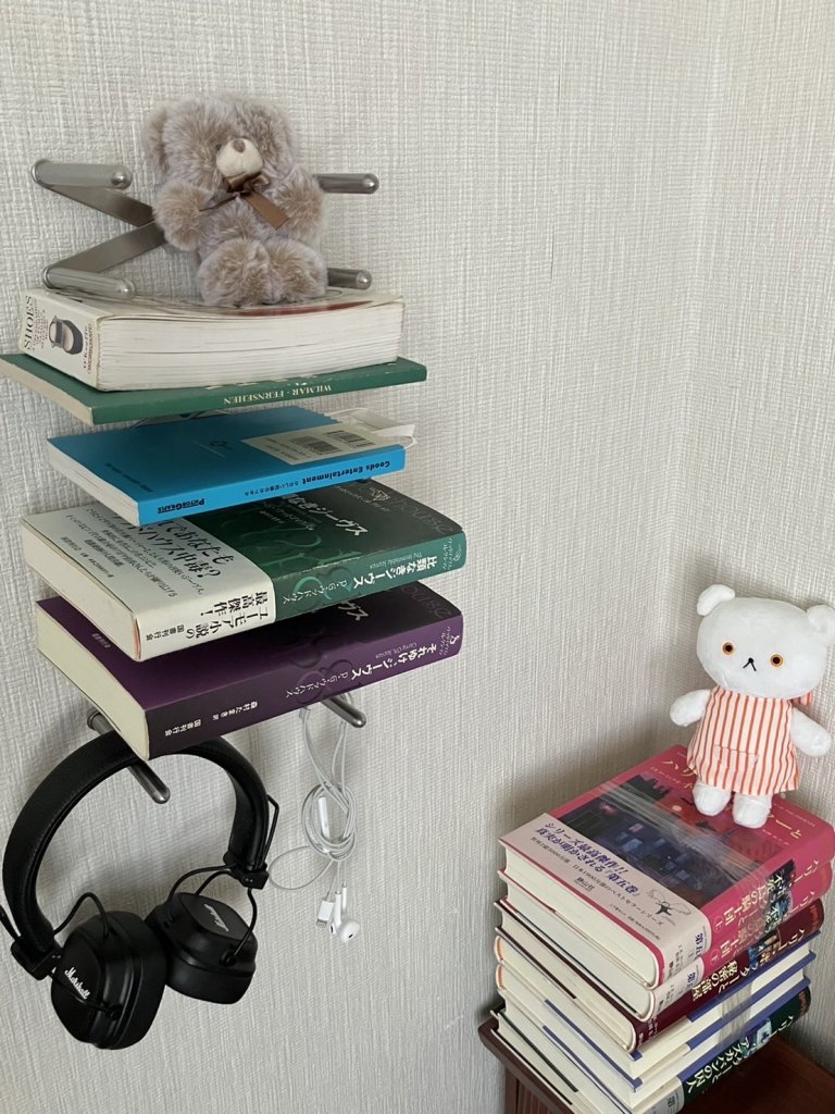 「フック型の画鋲に引っ掛けてるだけの簡単DIYです。SNSで見つけてやってみたのですが、思っていた以上に耐久性もある。本と一緒にヘッドホンなども引っ掛けて収納しています」