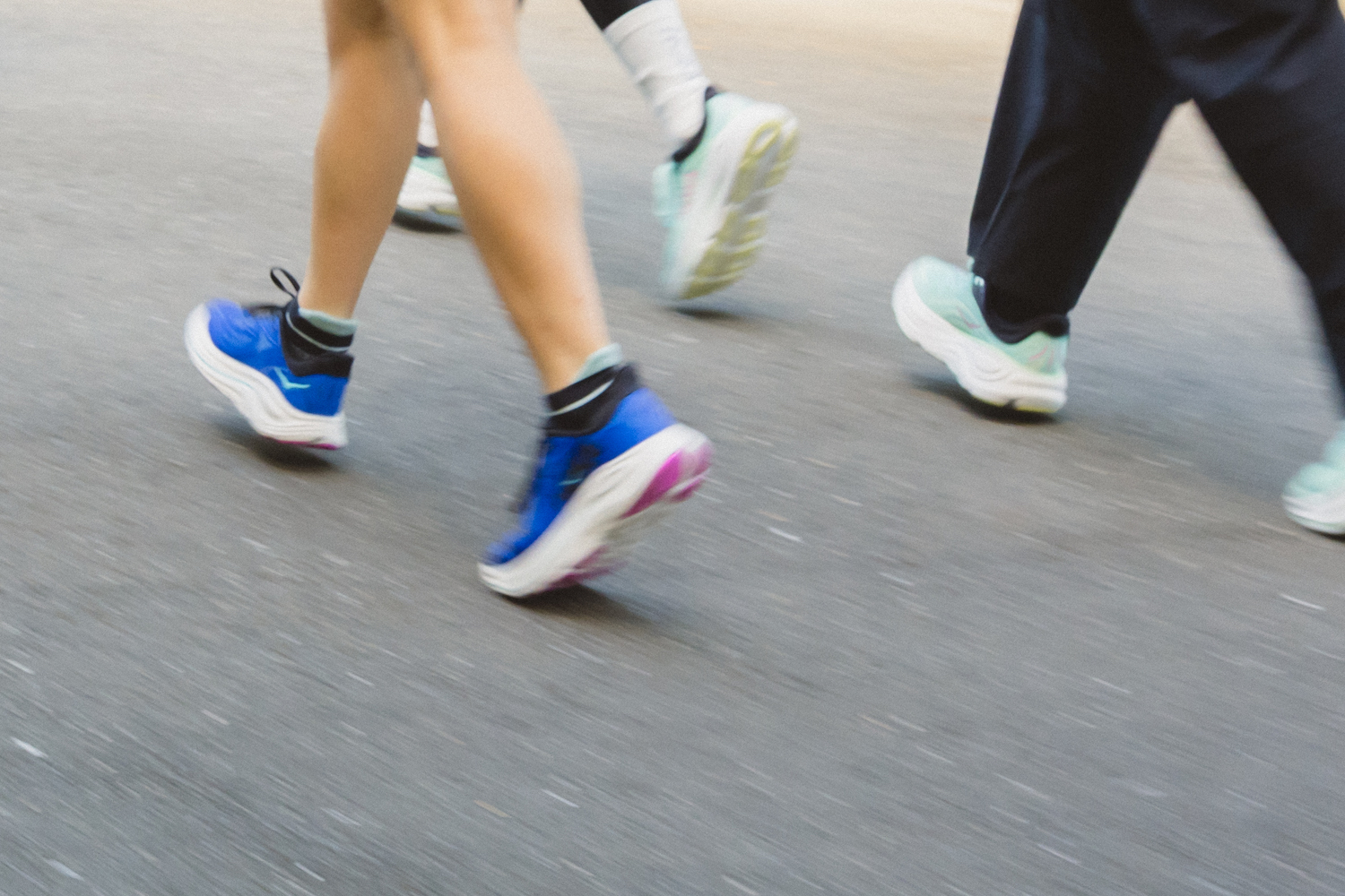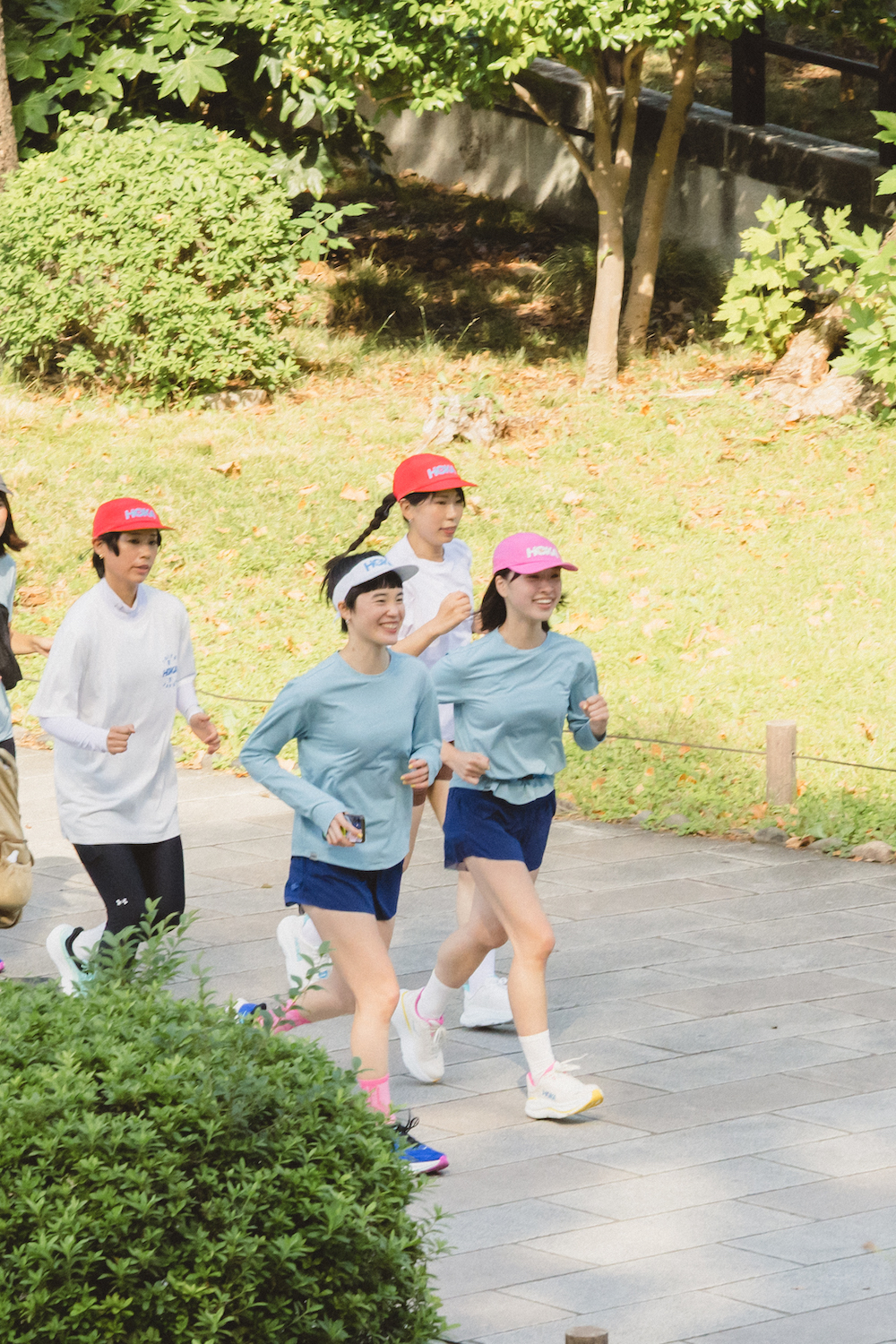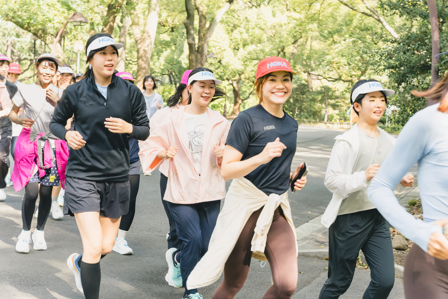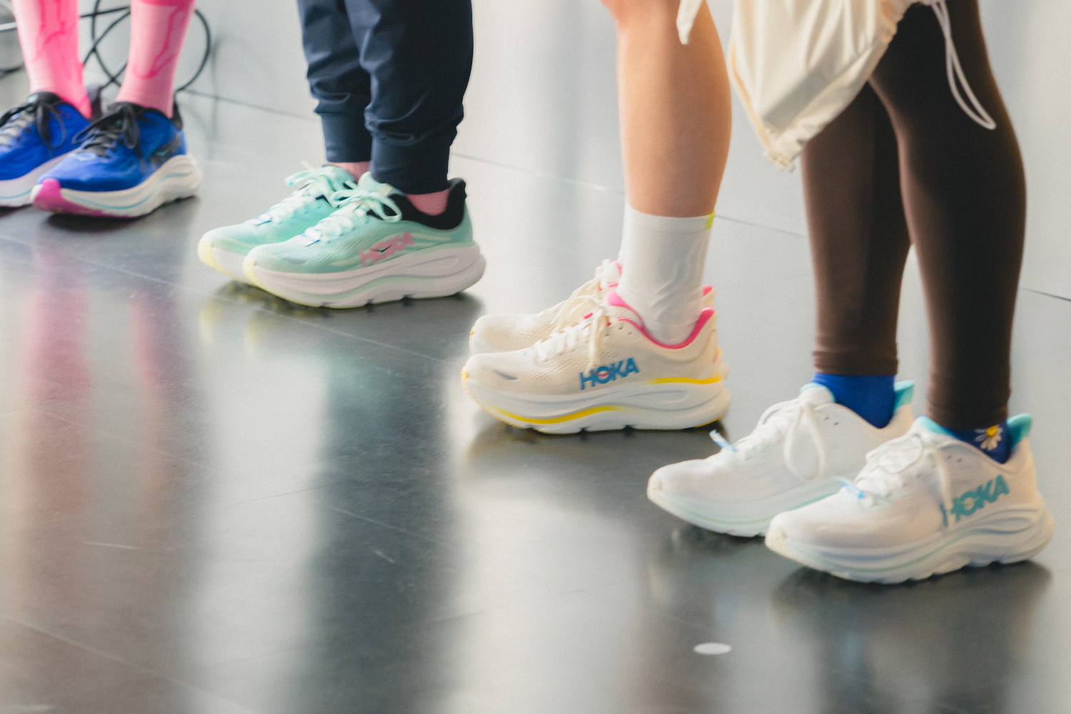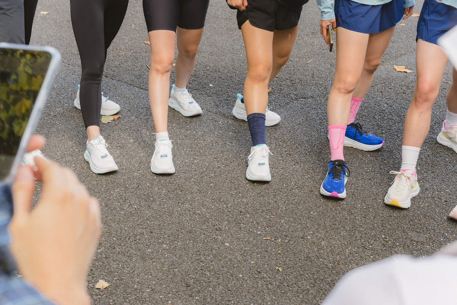 今回は全員で、《ホカ》のランニングシューズ「BONDI 9」と「CLIFTON 10」を試し履き。「BONDI 9」は安定感とクッション性に優れ、膝や腰にやさしい設計。「CLIFTON 10」は軽さと推進力のある人気モデル。ホワイトやブルー、ピンクなどカラフルな足元が並び、準備万端。ペーサーの桜子ちゃんのサポートのもと、ストレッチも抜かりなく。