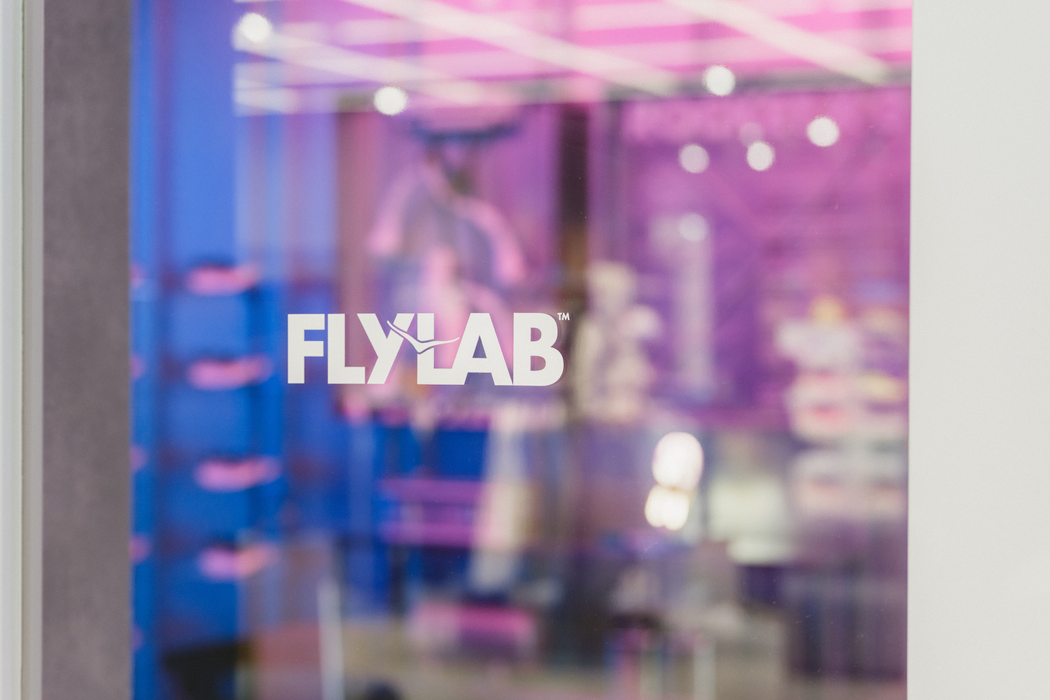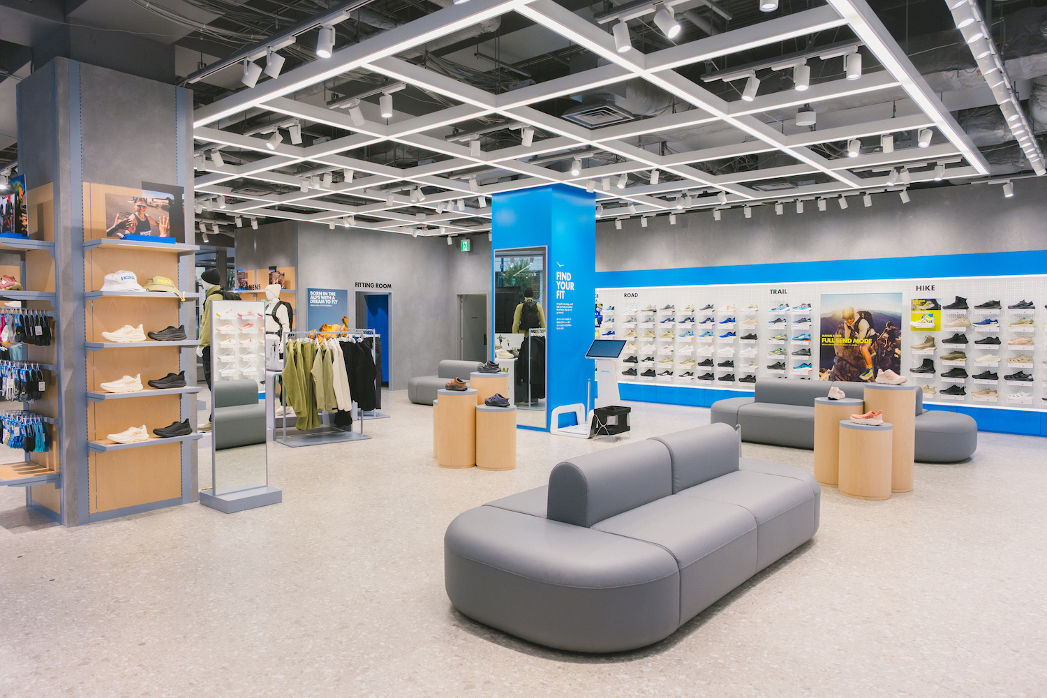 カフェタイムの後は、特別にオープン前のショップへ。ランニング、トレイルランニング、デザイン性を楽しめるライフスタイルモデル、アパレルやアクセサリーまで幅広いラインナップがずらり。気になったシューズはお隣のFLY LABスペースに持っていくと…