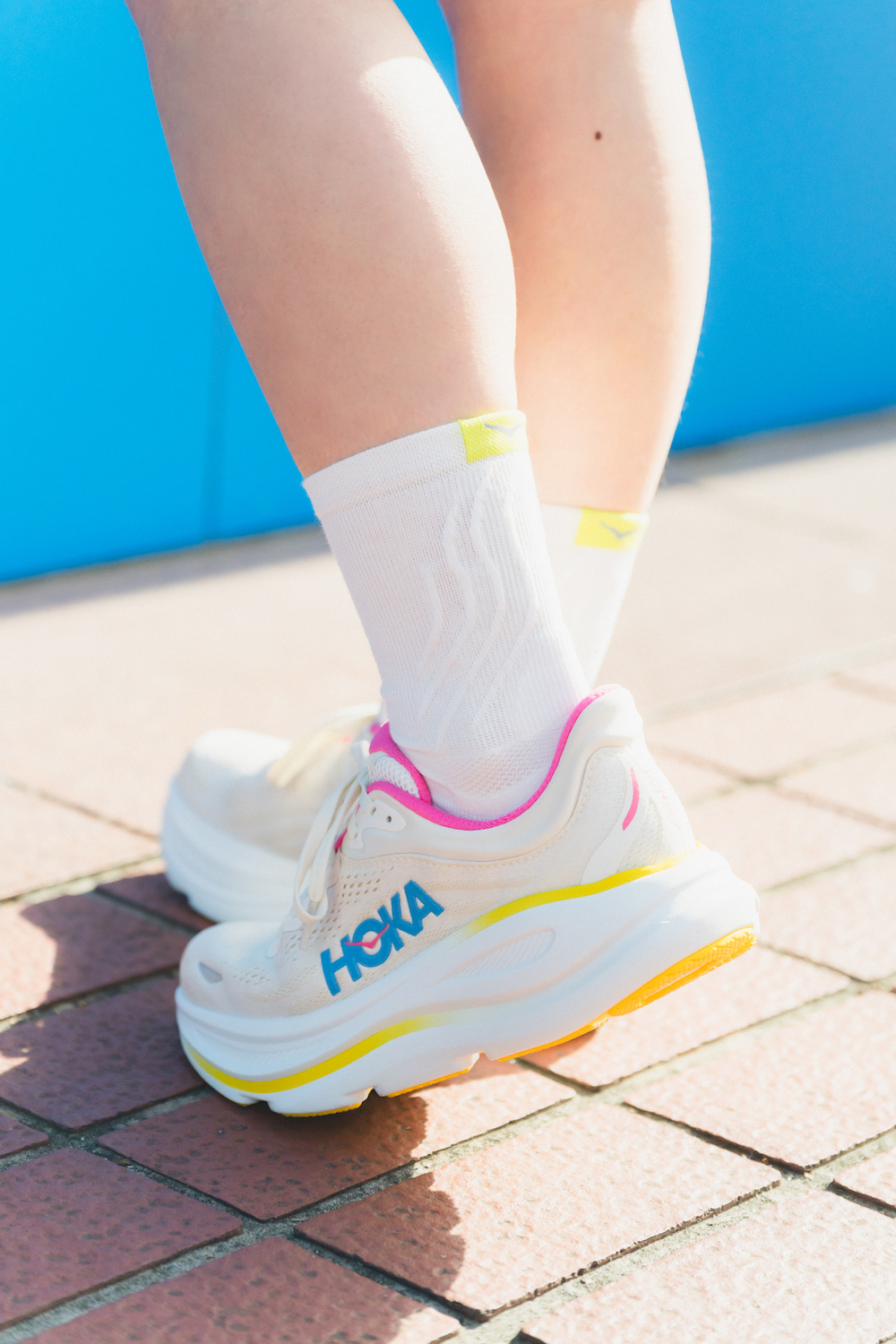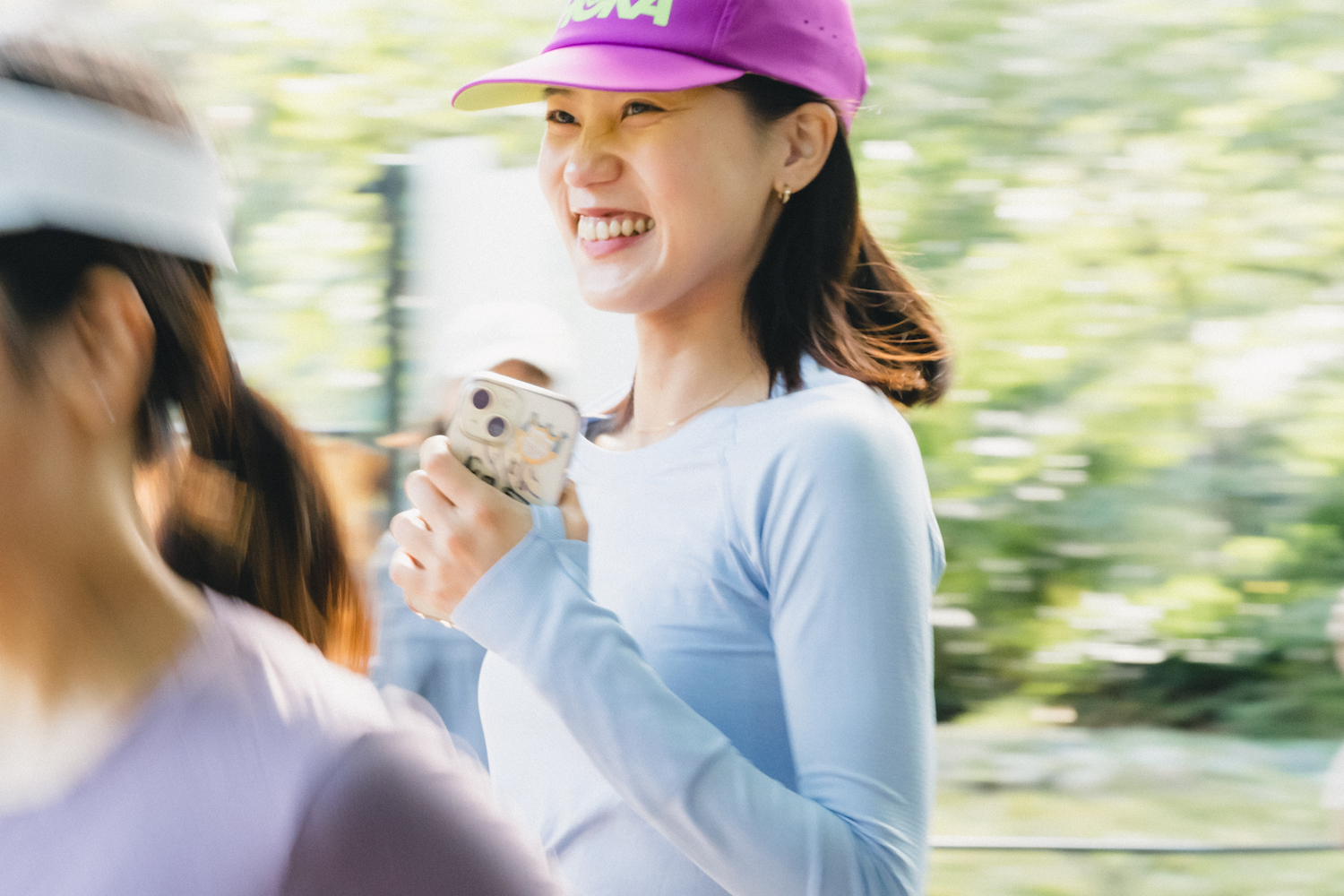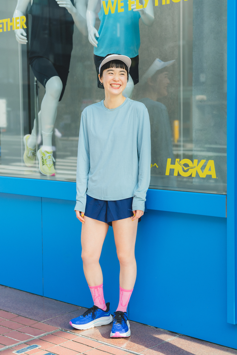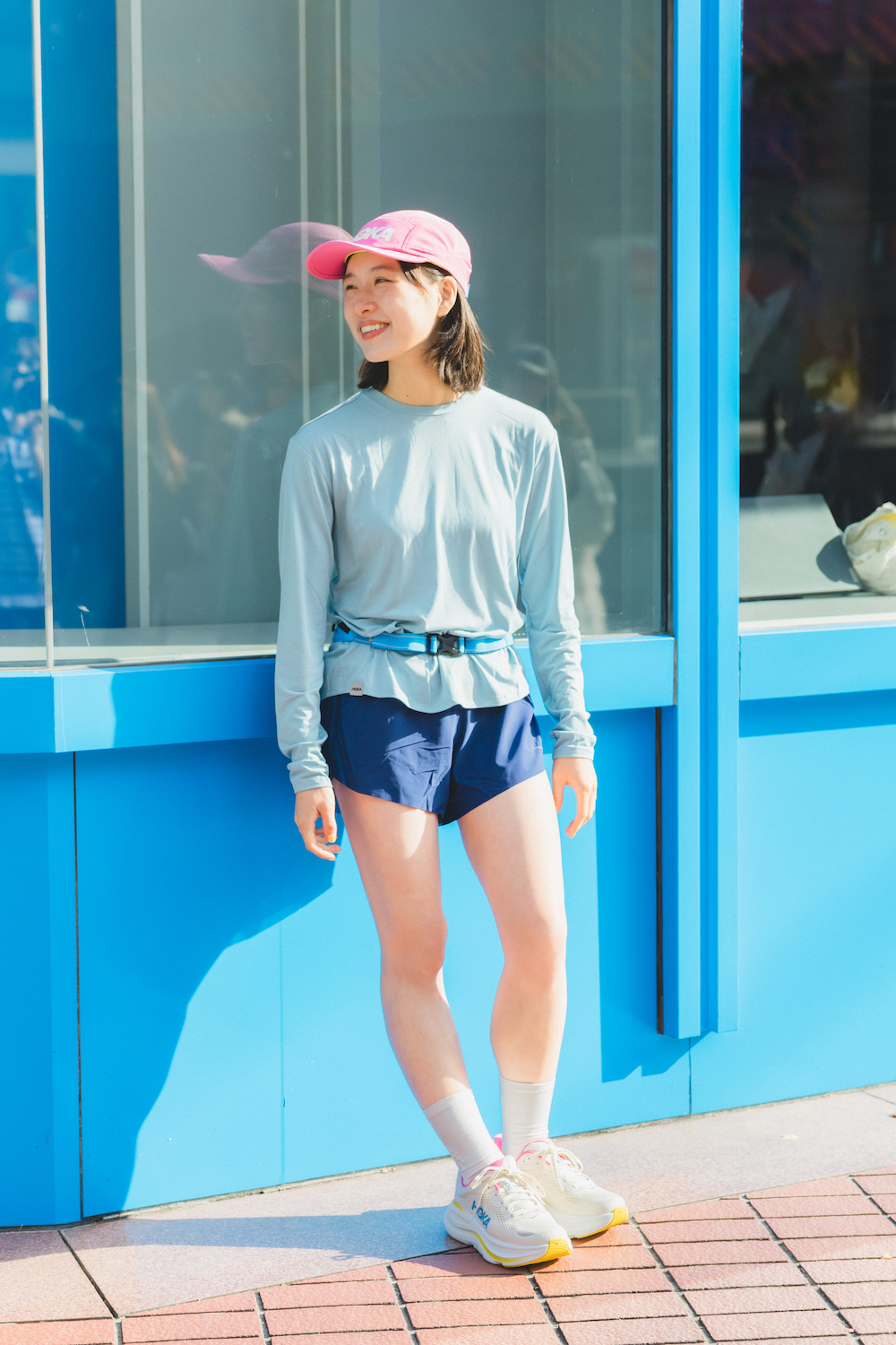 モデル・女優として活躍。ランニング部初参加で、ランニングもほぼ初めて。「わたしはふかふかのBONDI 9を。初心者なので、カラフルで遊び心のある足元でテンションをアップ!ウエストポーチもお気に入りで、ブルー×イエローの配色が可愛いんです。コンパクトだけど収納力があって、普段使いもできそう!」